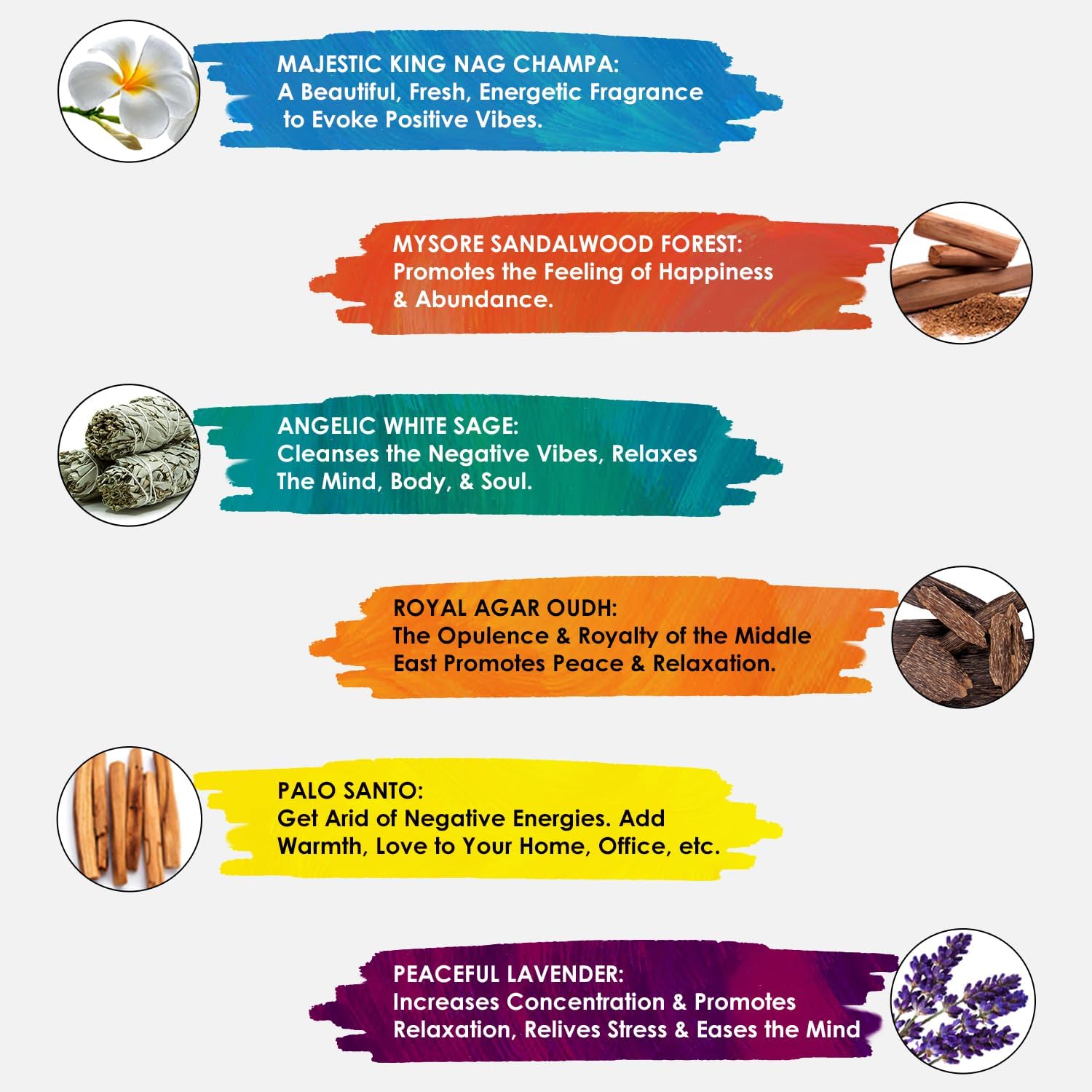 - 🌿 All-Natural Variety Pack – 6 Calming Fragrances for Every Mood: Indulge in a curated selection of natural incense sticks with 6 distinct fragrances: Sandalwood, Nag Champa, Agar Oudh, Palo Santo, White Sage, and Lavender. This value incense gift set includes 120 hand-rolled, non-toxic sticks, each infused with traditional Ayurvedic essential oils. Ideal for those seeking aromatherapy incense, meditation accessories, or a spiritual cleansing tool.