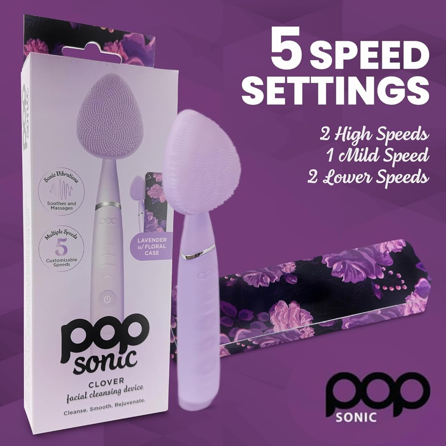 Clover Facial Cleansing Device Lavender Silicone Facial Cleaner & Exfoliator w/ 8000 Vibrations Per Minute, 5 Speeds, USB Rechargeable Face Cleaning Scrubber & Skincare Tool with Case