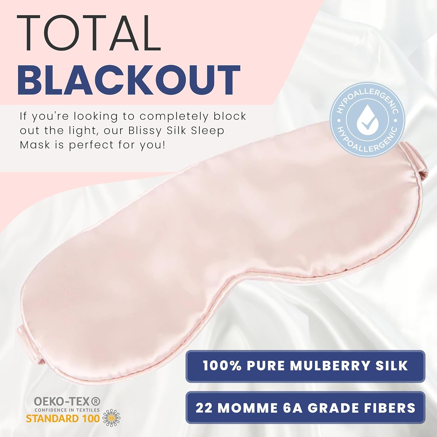 • TOTAL BLACKOUT - If you're looking to completely block out the light, our Blissy Silk Sleep Mask is perfect for you! Made with 100% pure Mulberry silk and 22 momme 6A grade fibers, this mask will keep the light out and help you get a good night's sleep.