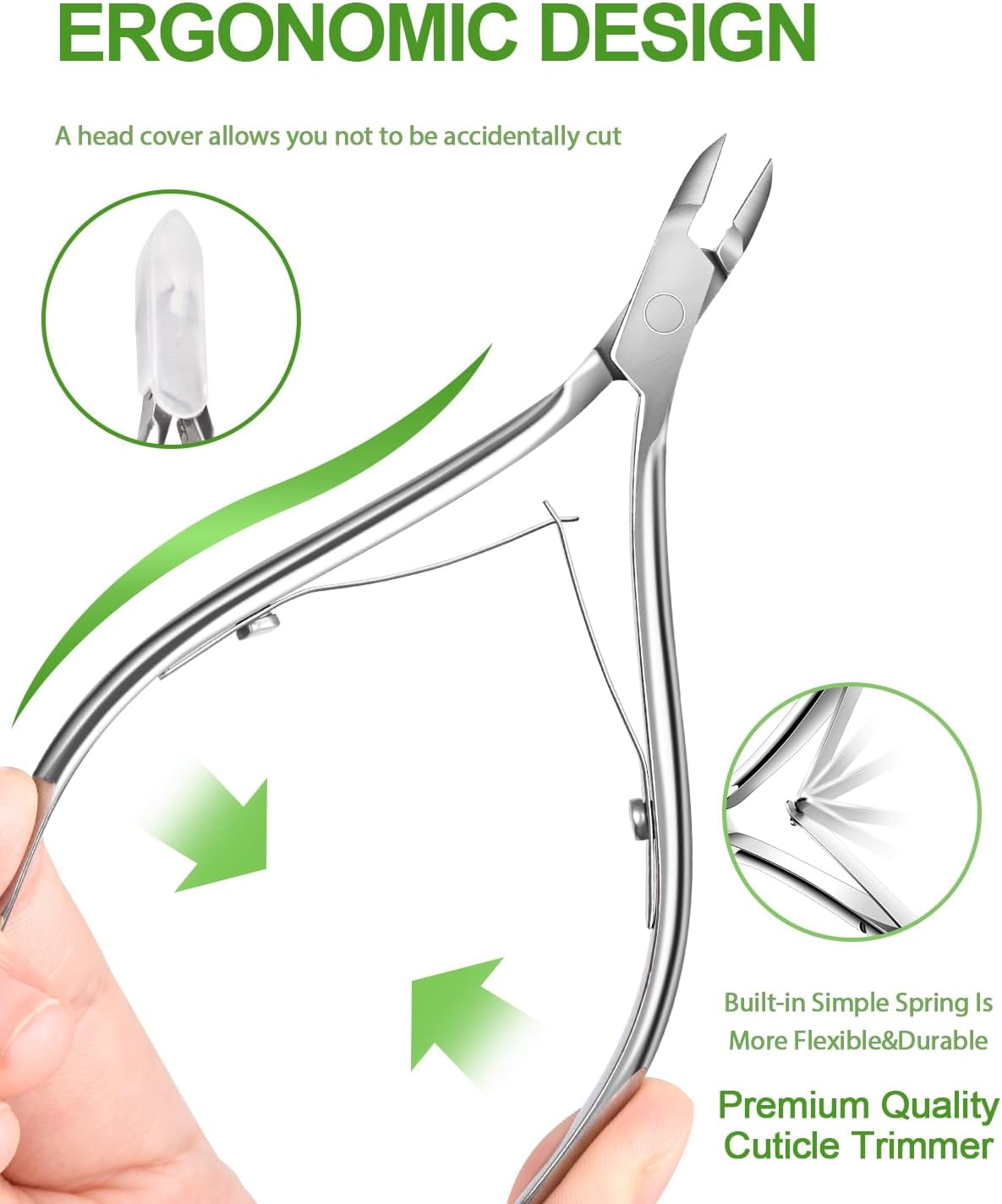 - 5 in 1 Cuticle Trimmer Set: The stainless steel cuticle clippers for nails are sharper and more efficient for a long time, making sure the cuticle easily removed. Other 4 pcs manicure tools help you reach nail edge more easily to remove the stubborn debris effortlessly