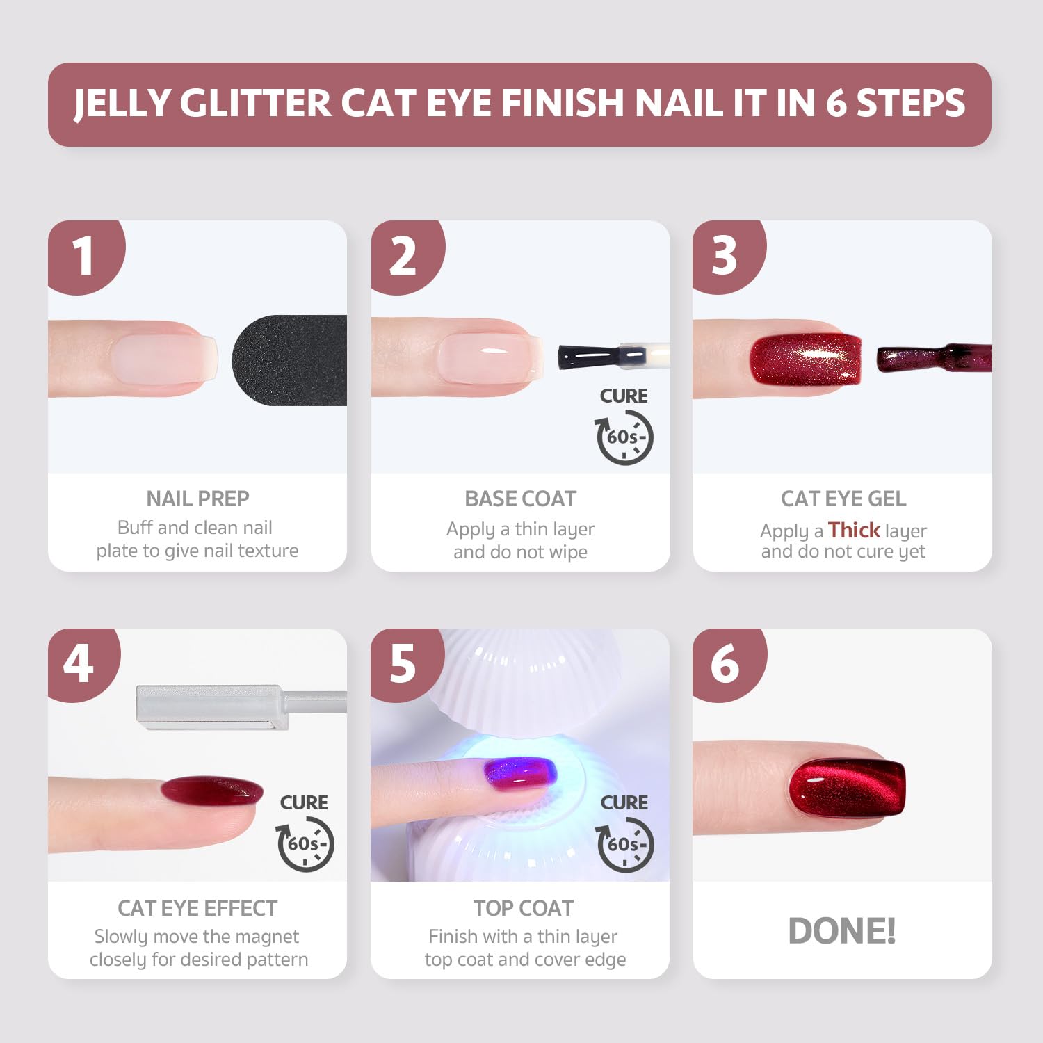 - Glitter Cat Eye: Use the magnet to create desired pattern before curing. Apply gel top coat for gorgeous shimmery and sparkly finish. Heat up in winter to reduce thickness.