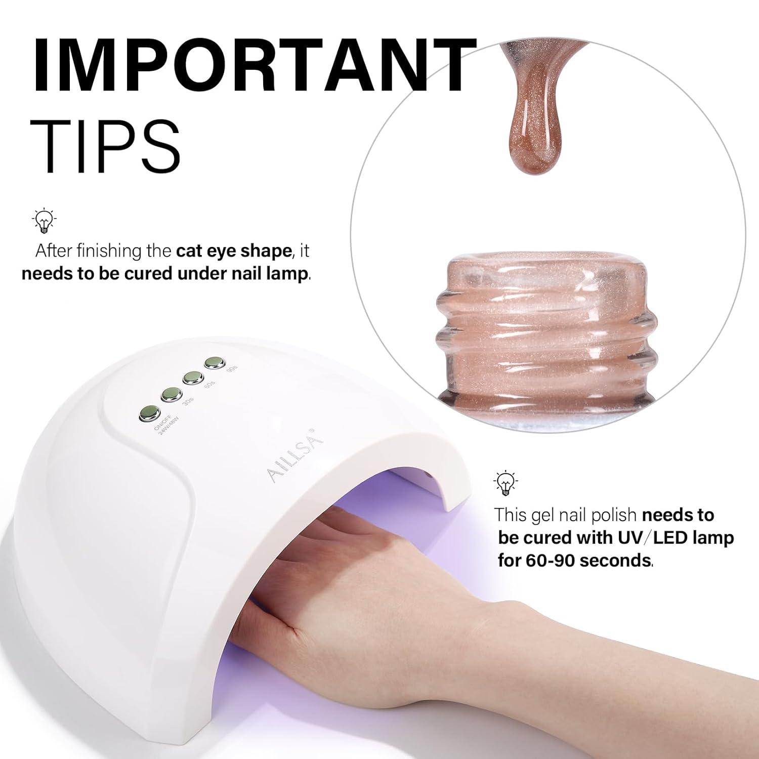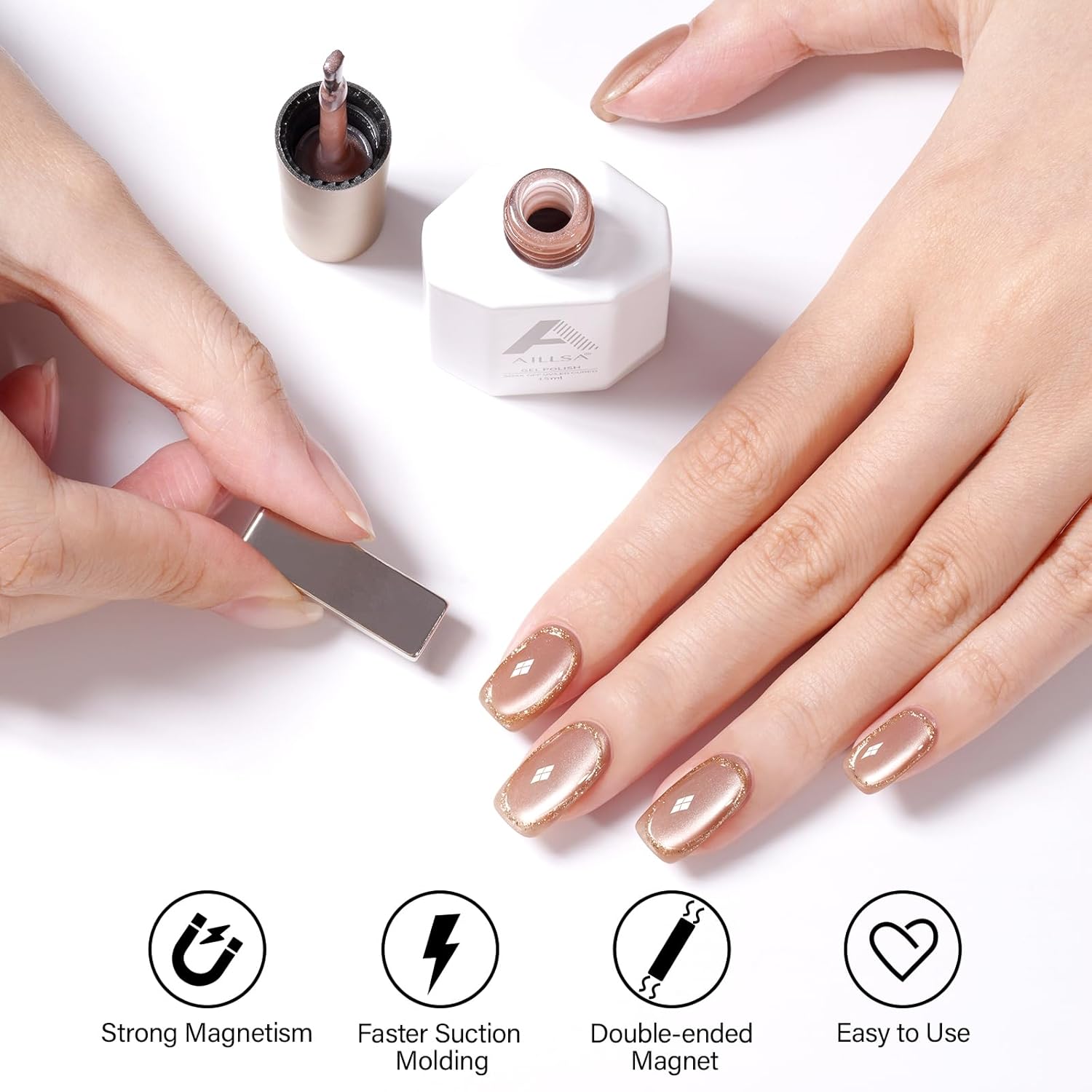 • CRYSTAL SPARKLING EFFECT - AILLSA Cat Eye Gel Nail Polish has a dense magnetic powder that can be used alone for a mirror-shimmering, crystal-clear manicure or with any base color nail polish, jelly gel nail polish, and other nail polishes.
