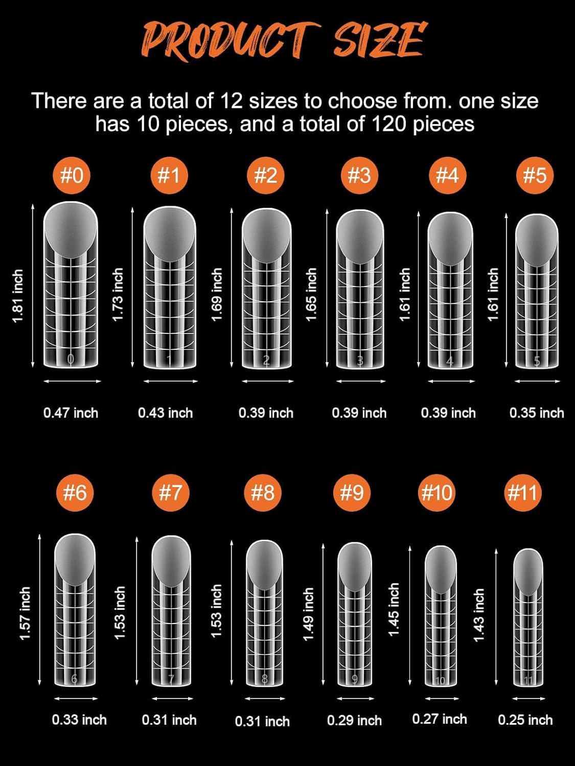 • 【Nail Form Mold with 12 Sizes】120pcs clear nail forms offers 12 different nail sizes , and each size of long nail tips is separated by a small grid, a total of 12 grids, so they're easy and convenient to choose the suitable size to meet your nail's need.