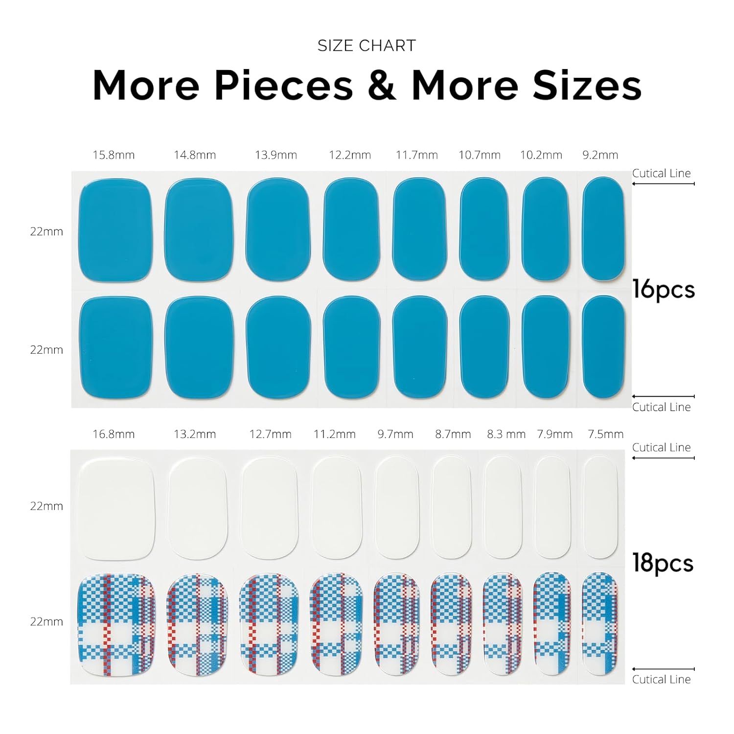 - ă34 PCS NAIL STRIPSăMore Quantity & Sizes than Ever! - With 17 different sizes of our nail art stickers, you can easily find the right size to match your nails. - New curved side line fits even better with your nail shape for seamless adhesion.