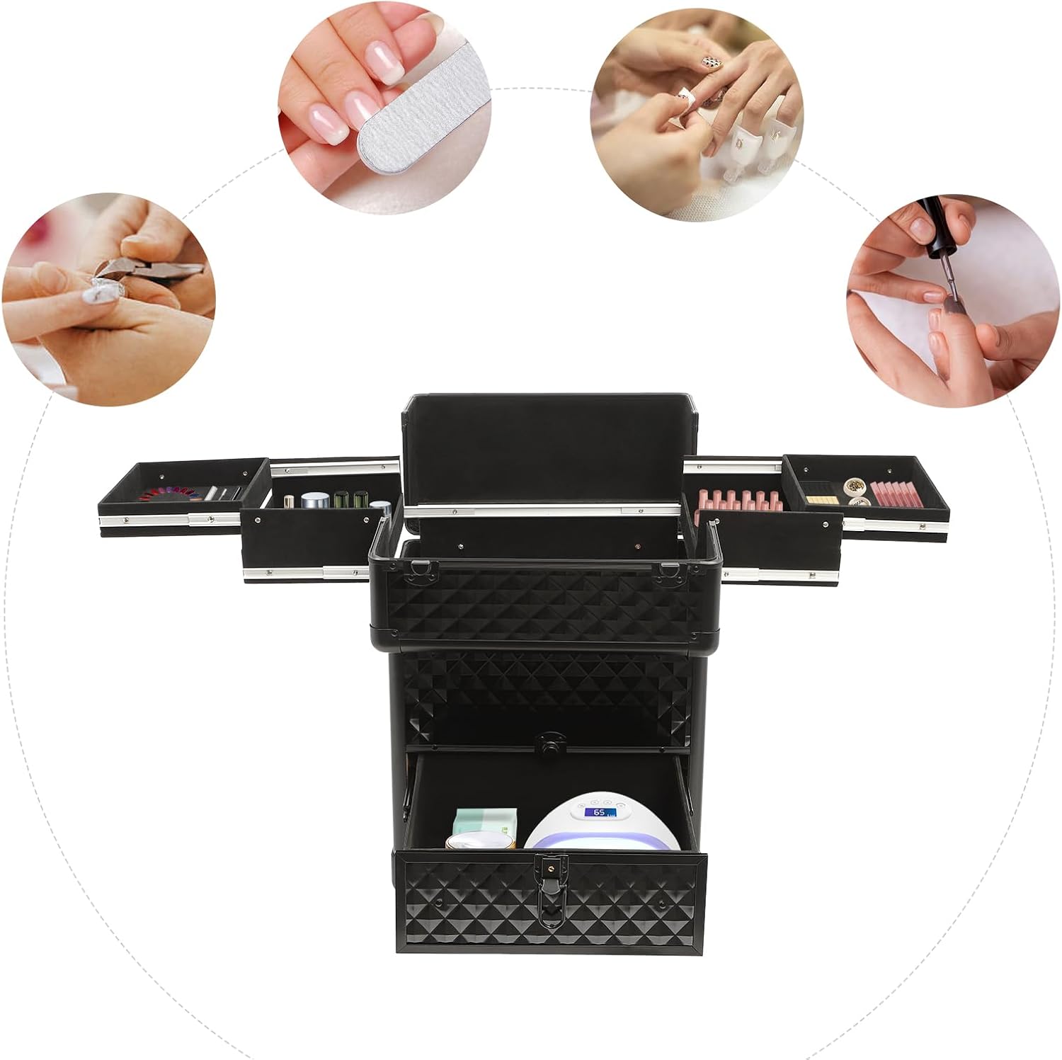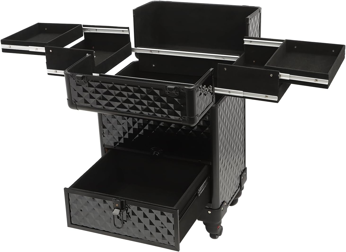 Rolling Makeup Train Case Professional Cosmetic Organizer Large Capacity Trolley Makeup Travel Case with 360° Swivel Wheels for Makeup Artist (Black)