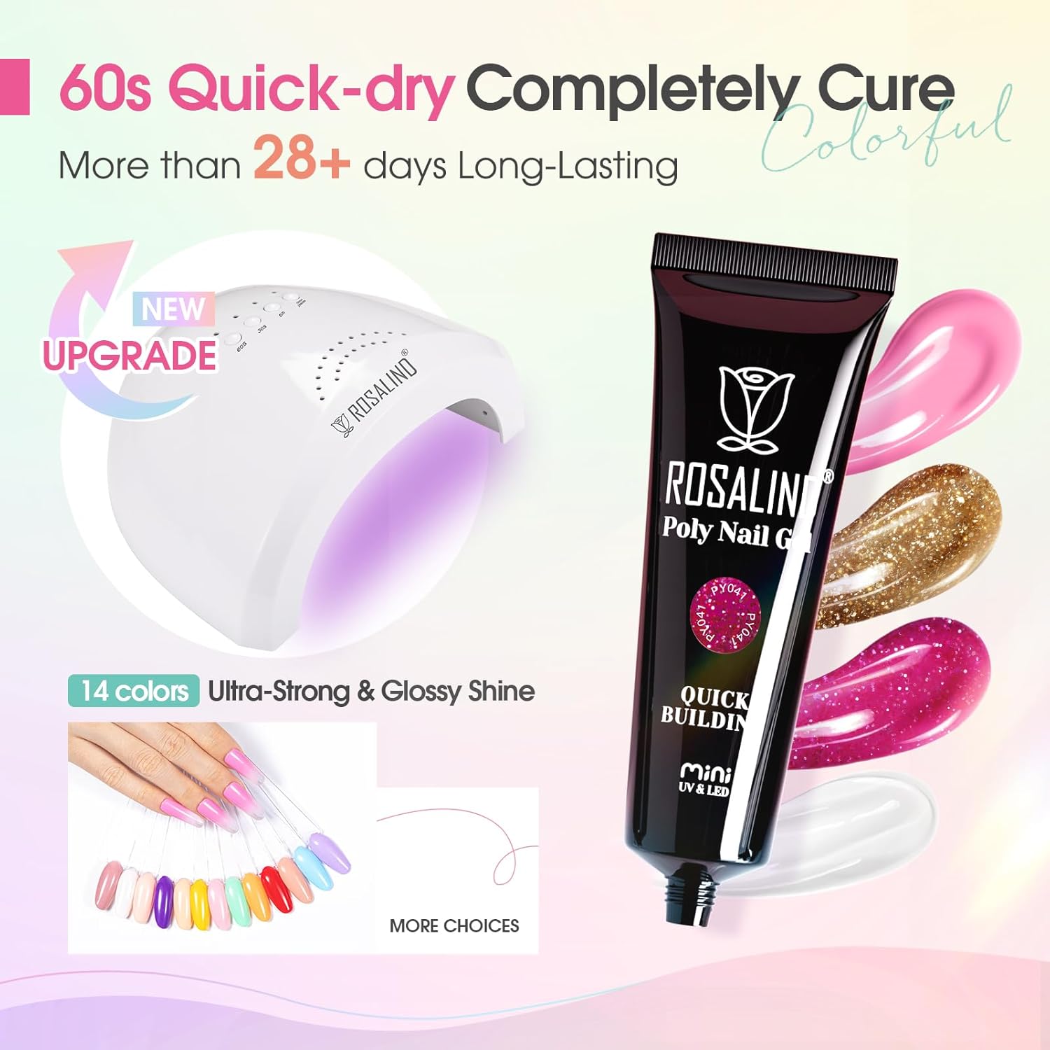 - Versatile Use: With 14 beautiful and trendy colors, it is suitable for nail art beginners and perfect for gift giving. ROSALIND poly nail extension gel kit is perfect for creating rhinestone nails, dry flower nails and glitter nails, as well as press-on nails on manicure. This poly extension gel is suitable for different shapes of nails such as square, oval, coffin and French nails.