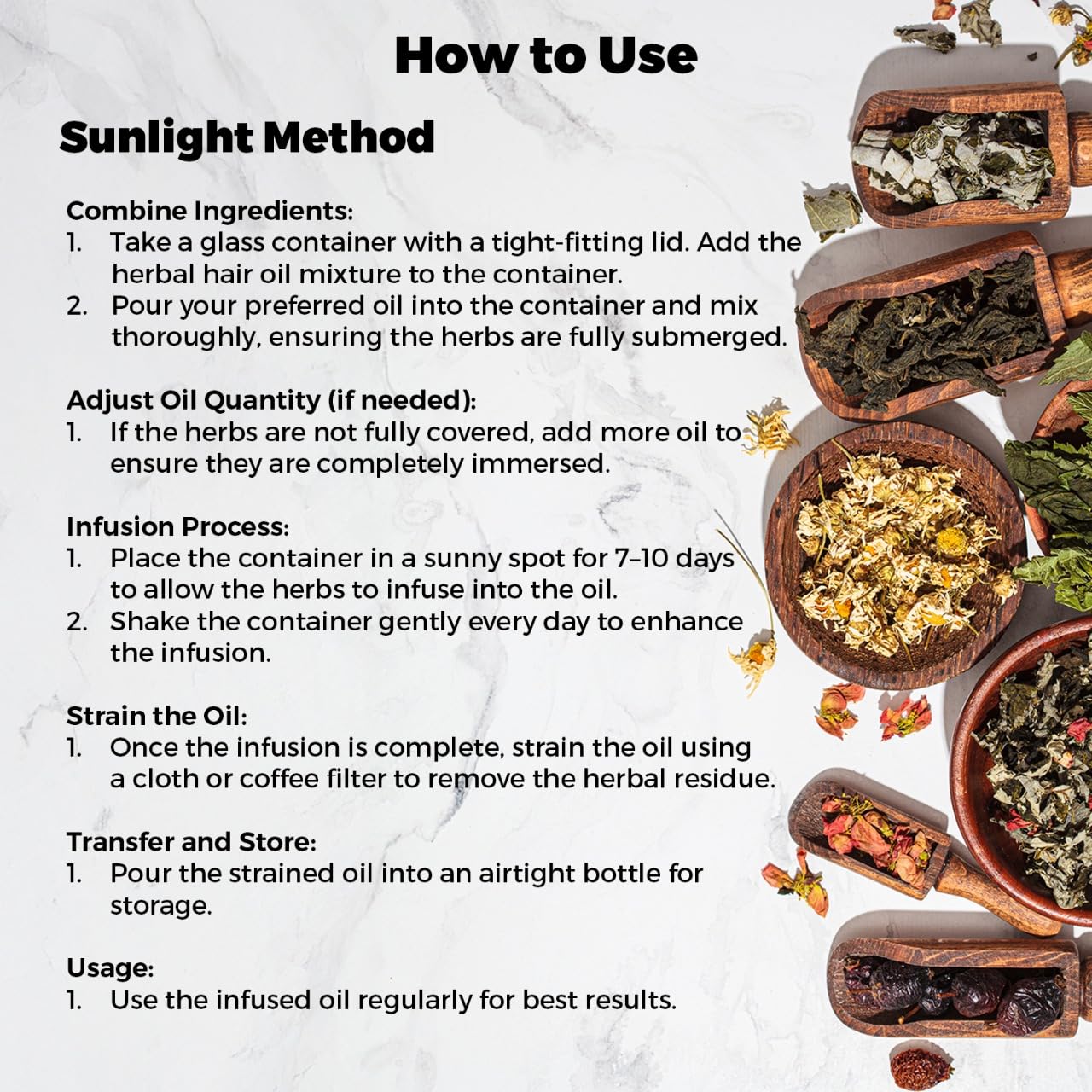 - Sunlight Method Uses: In a glass container with a tight-fitting lid,add 1 packet of our herbal hair oil mixture and your choice of oil.Mix well,making sure the herbs are completely covered.If needed,you can add more oil.Set the mixture aside in a sunny place for 7β10 days,allowing the herbs to infuse in the oil.If sunlight is not available use double boiler method.Once the oil is infused,you can strain it using a cloth or coffee filter. Store the oil in an airtight bottle and apply it regularly