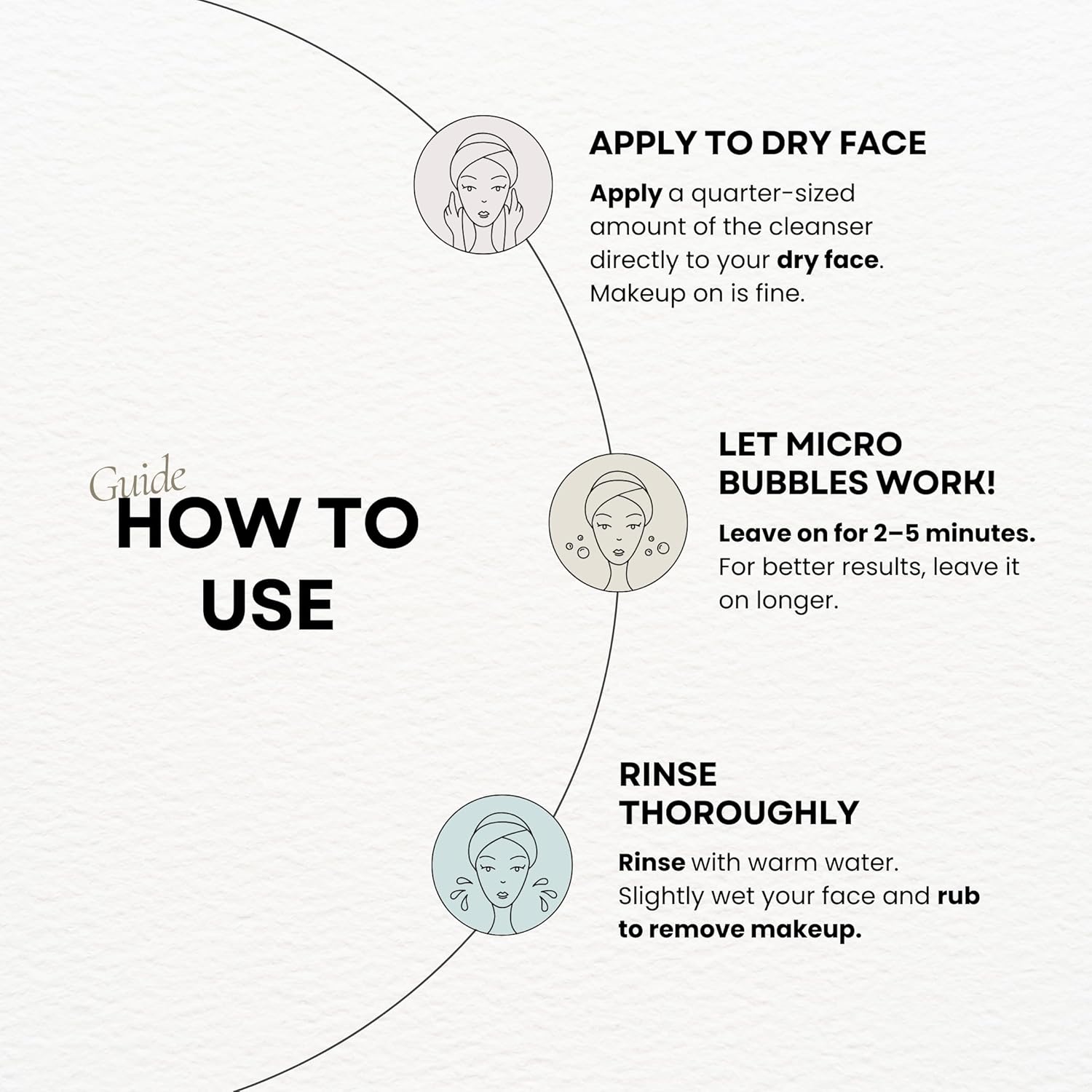 - EASY TO USE β Whether you have makeup on or a bare face, simply apply the cleanser without water, and it will instantly form fine bubbles. The bubble foam penetrates deep into pores to remove impurities, then rinse after 1-5 minutes for a deep pore cleansing experience, leaving skin fresh and purified.