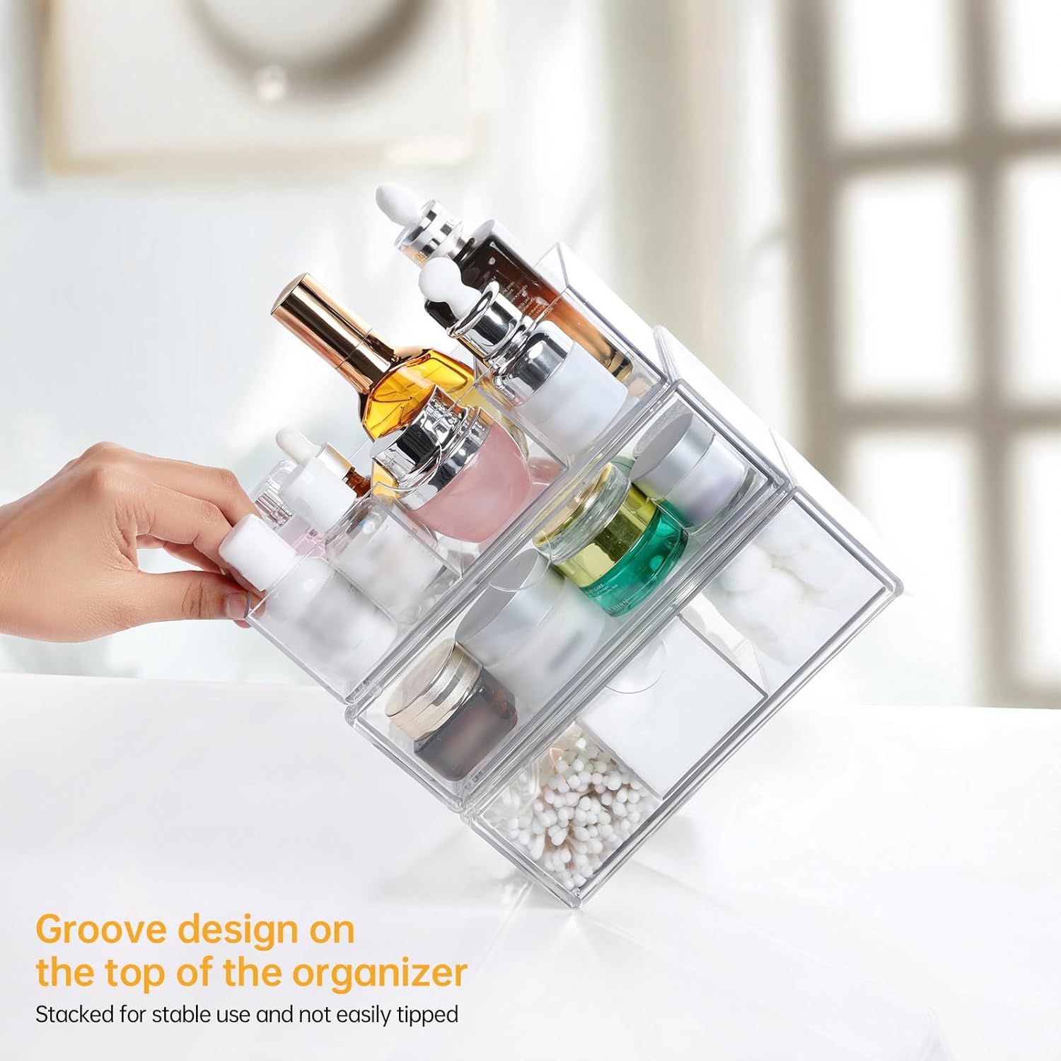 Medicine Cabinet Organizer 3 Pack, Plastic Stackable Storage with 2 Drawers, Bathroom Mirror Cabinet Organizer with Removable Dividers for Wall Cabinet, Vanity, Countertop, Clear