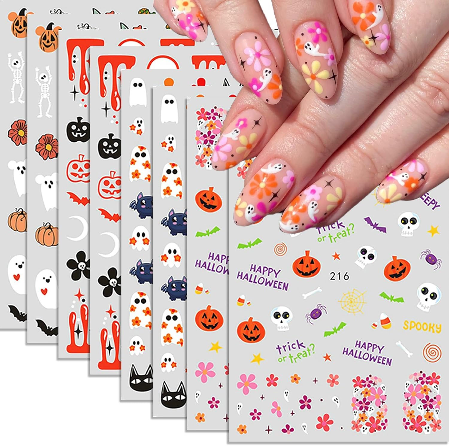 Halloween Nail Art Stickers 8 Sheets Cute Little Ghost Skull Pumpkin Floral Nail Art Self-Adhesive DIY Nail Decal Stickers Nail Fall Decoration Thanksgiving Nail Supplies for Women Girls Kids