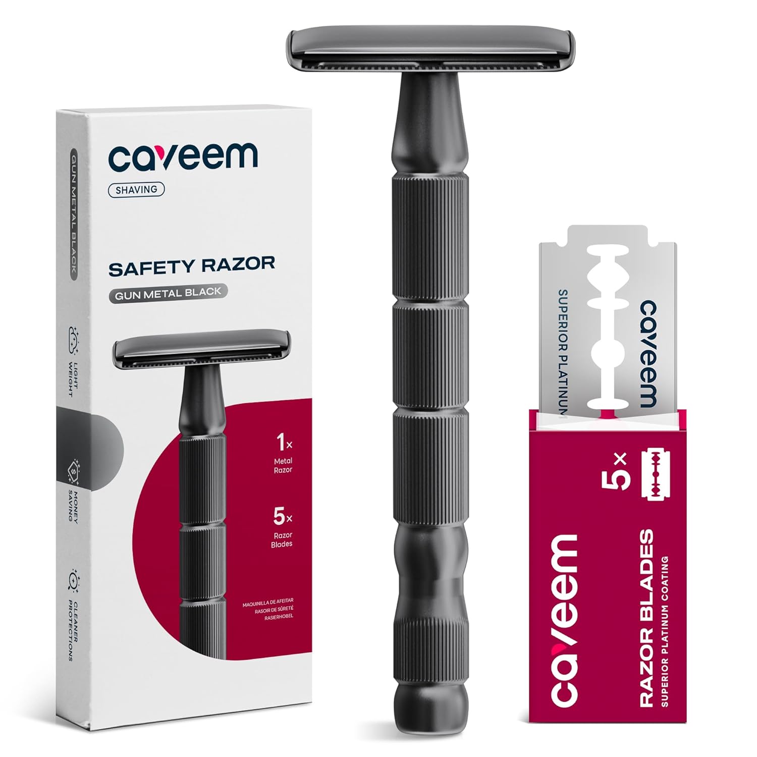 - LIGHTER PACKAGING : With a weight of 2.21 oz, CAVEEM's non-plastic razor set is portable to use. To maintain your razor for life-long use, rinse thoroughly after each use, dry completely, and store the razor in dry places for good condition