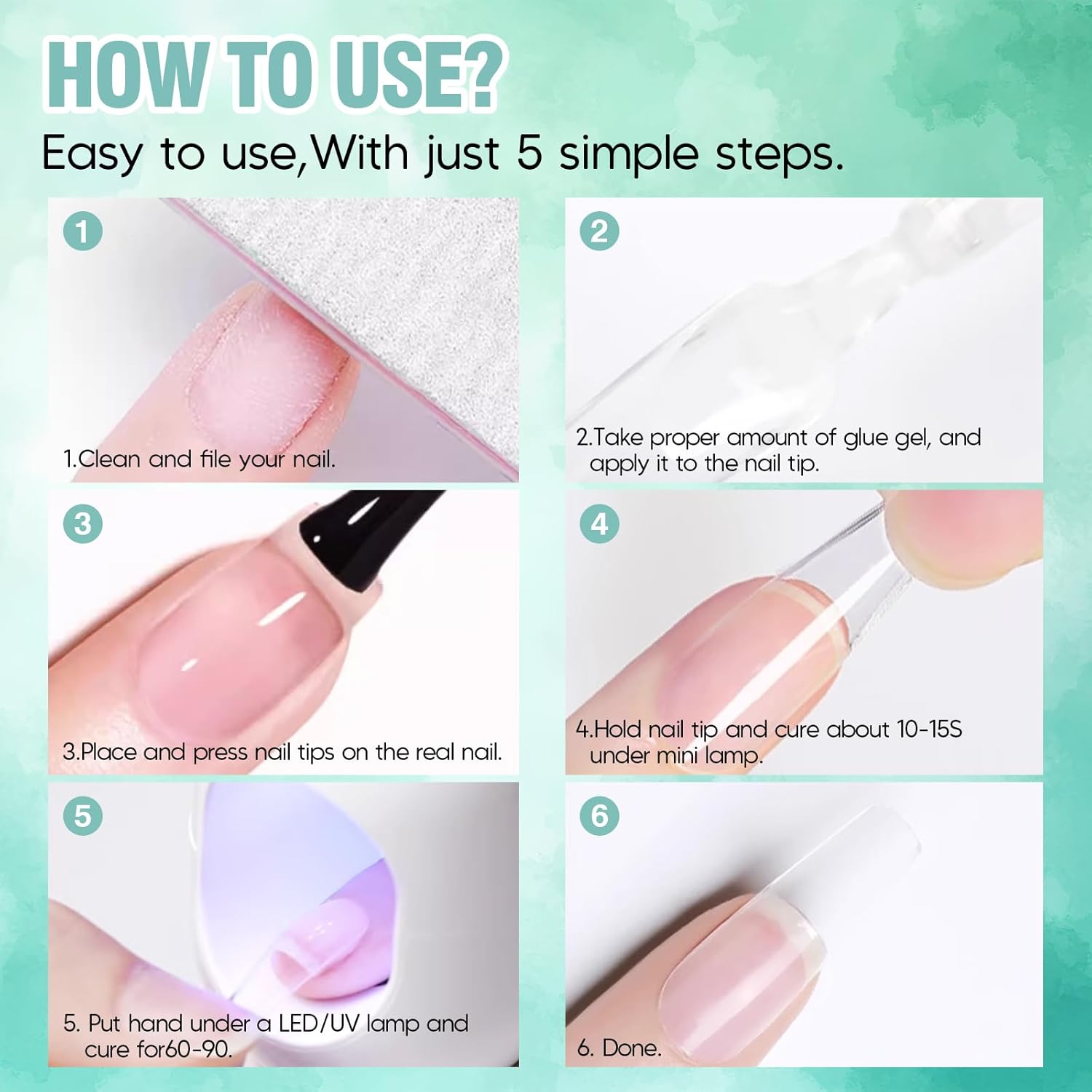 - Easy to use: 1. Well-prep your nails with nail pusher, cuticle cutter, nail file and nail buffer. 2. Apply the nail dehydrator and primer and let it dry by air. 3. Apply suitable amount of the glue gel on the false nail tips. 4. Place the false nails on the natural nails and press gently to avoid bubbles. 5. Cure it under the lamp for 60s-90s. 6. Apply gel polish, poly nail gel,builder gel,nail polish and other nail products you like.