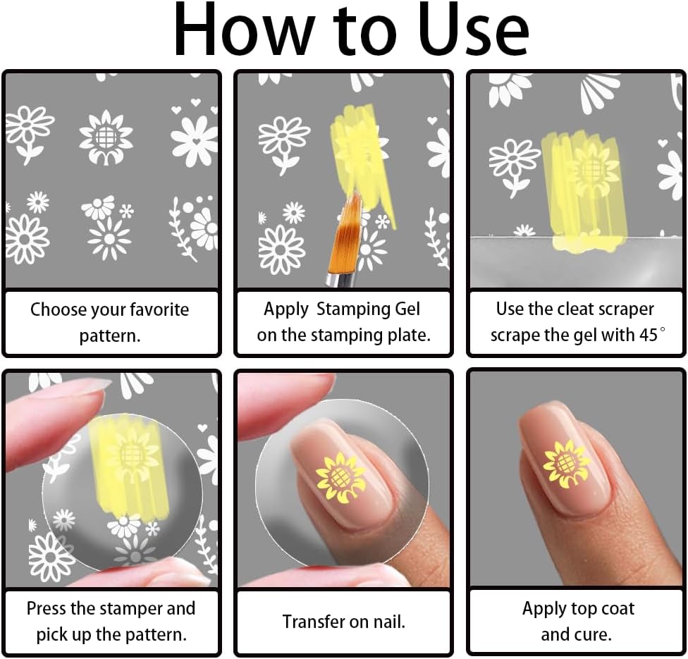 - Easy to Use: 1. Apply paint adhesive to the stencil, then use a scraper to quickly scrape off the excess 2.Use a silicone stamper to press down on the transfer pattern 3. Quickly transfer the pattern onto your nails 4.Bake dry to apply sealer then shine the lamp