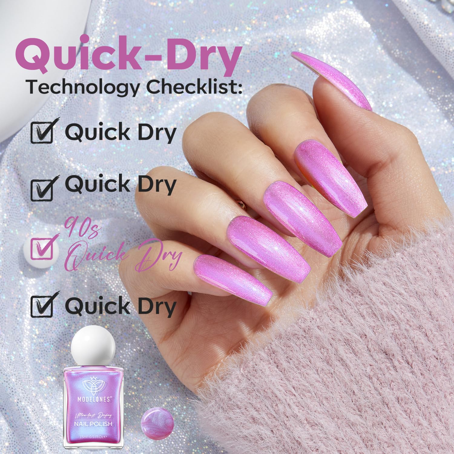 • No U V Needed & Quick Dry: With modelones innovative quick dry formula, say goodbye to long drying times and hello to flawless nails in 90 seconds. This nail lacquer is anti-chip and anti-peel, offering a "no streaks, no hassle" experience and bringing you the long-lasting shine of more than 8 days