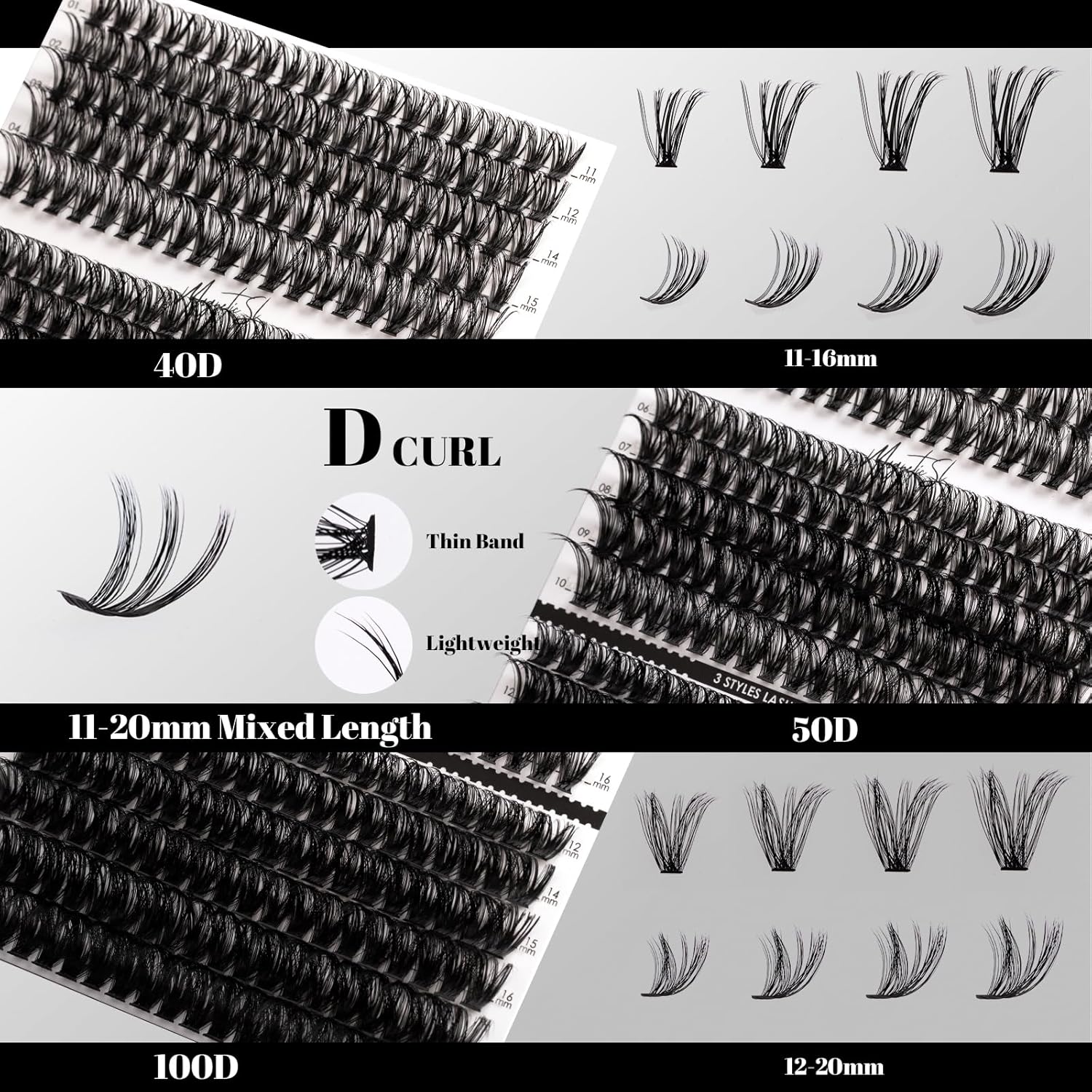 • Different Choices, Different Styles: Use our lash clusters of varying lengths and volumes (11-20mm, 40D, 50D, 100D) to create a personalized eyelash style. Cluster lashes are versatile and suitable for various occasions, whether you're having a night out with friends, attending a special event, or at working day. You'll complete all these looks in no time!