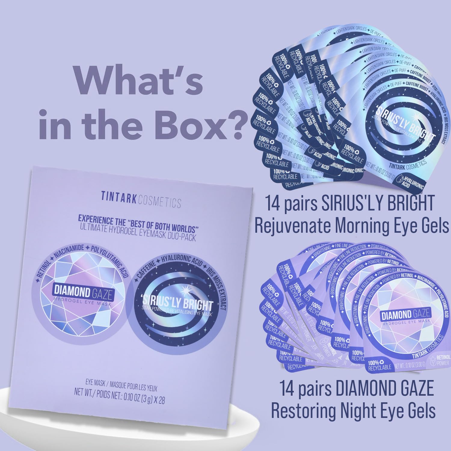 • ULTIMATE HYDROGEL EYEMASK DUO-PACK: Contains 14 pairs of SIRIUS'LY BRIGHT eye masks & 14 pairs of DIAMOND GAZE eye masks. Each pair of eye masks is independent packaging.