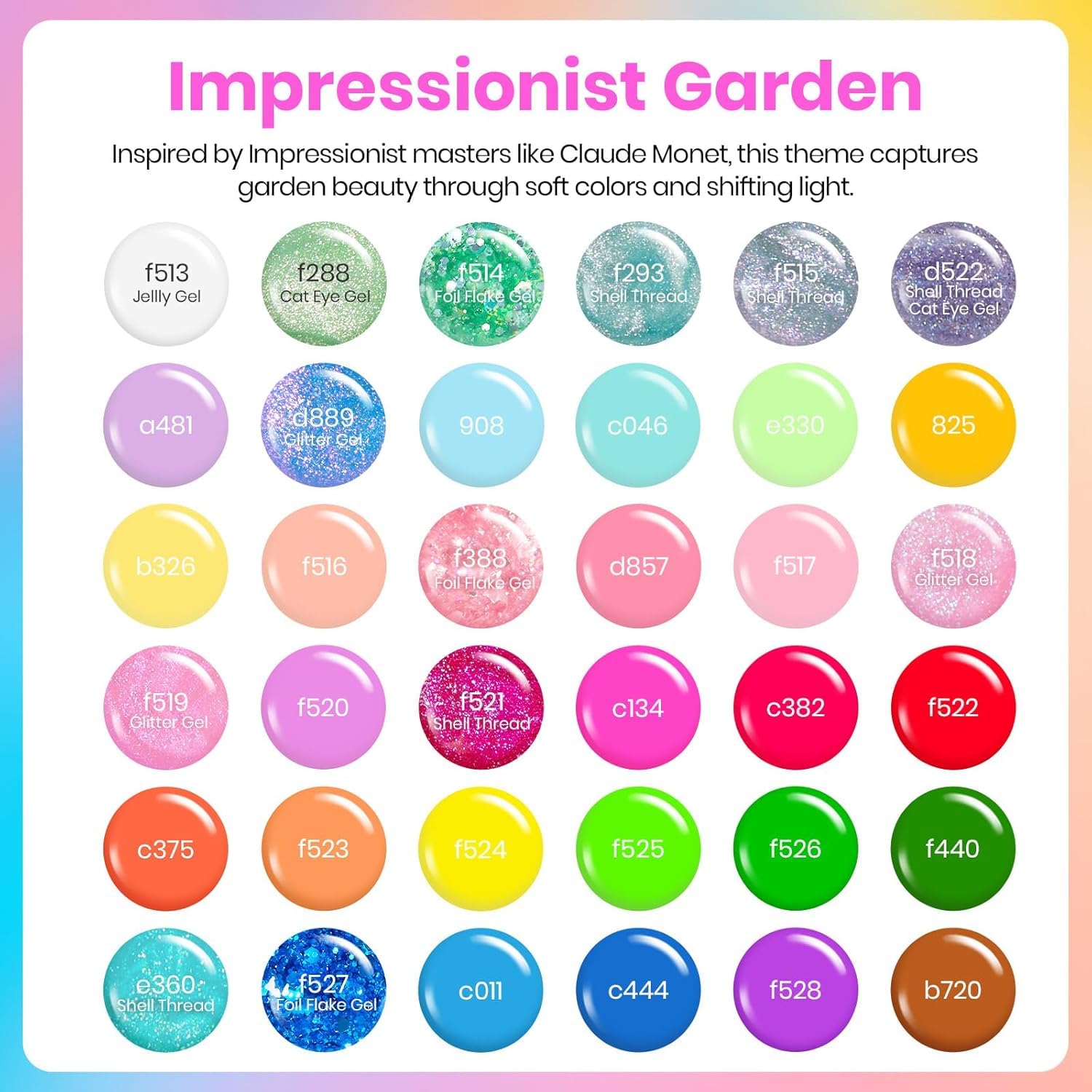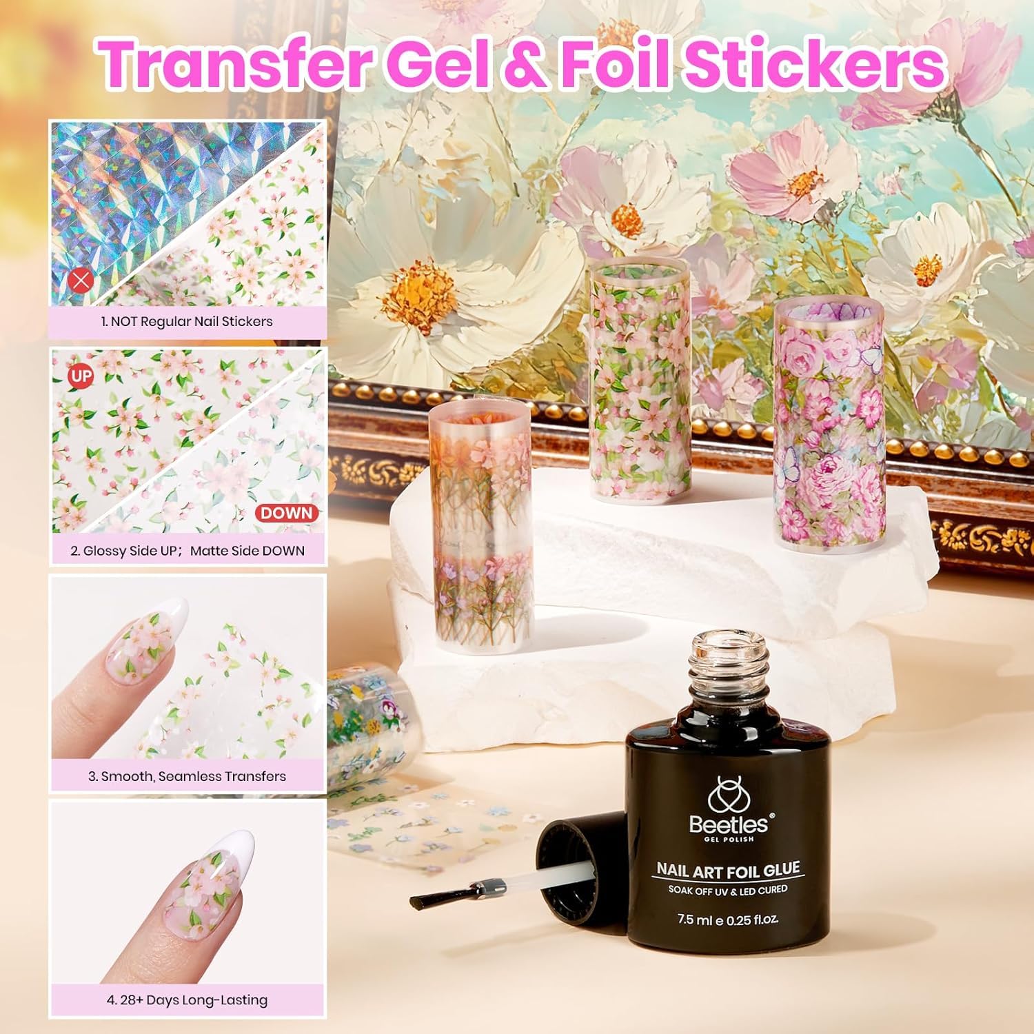 • 36 Colors Gel Nail Kit: Beetles gel nail polish including 36 classic and fashionable colors gel, 1 x No Wipe Base and 1 x Glossy Top Coat, 1 x Nail Art Foil Glue , 3 x Flower Nail Art Transfer Sticker. This Summer gel polish Impressionist Garden set is an essential for everyone!