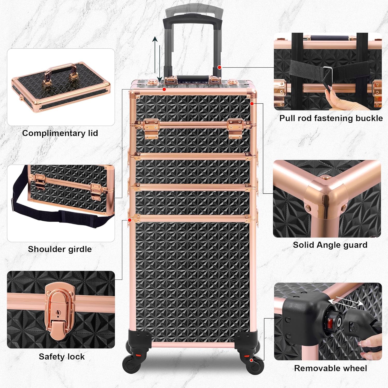 - 【Bonus Lid for Added Convenience:】The rolling makeup case is included a bonus lid that allows you to transform the portable makeup box into a standalone first layer. This means you have 7 different storage layer combinations at your fingertips, providing the ultimate versatility and organization for your beauty essentials.