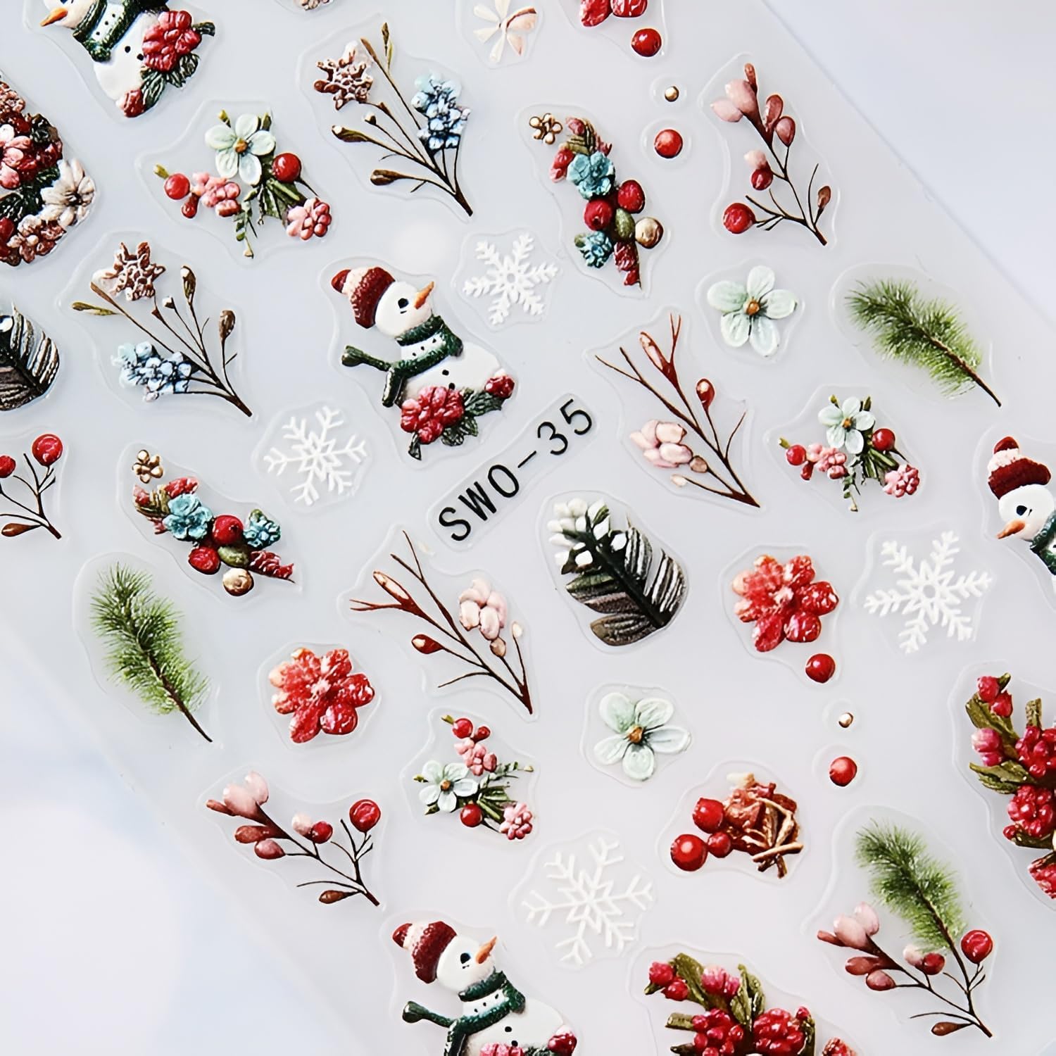 - ăChristmas Nail DesignăFeature 5D embossed self-adhesive Christmas nail decals for nail art with classic Christmas motifs such as Christmas trees, snowman, and snowflakes.These designs bring the holiday spirit to your nails, making them ideal for women and girls to celebrate the season.