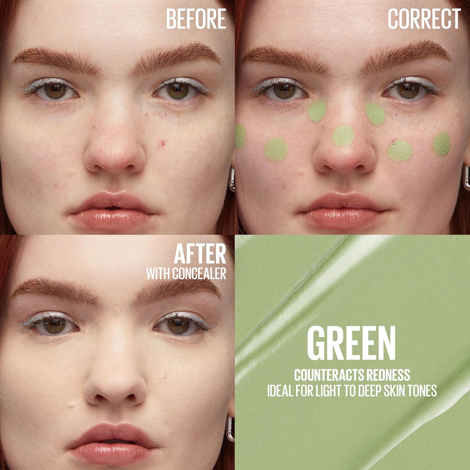 • 4 Color Correcting Shades: Pink corrects acts as a color corrector for dark circles & spots on light to medium skin tones, orange counteracts discoloration on medium to deep skin tones, yellow neutralizes dullness & green concealer counteracts redness
