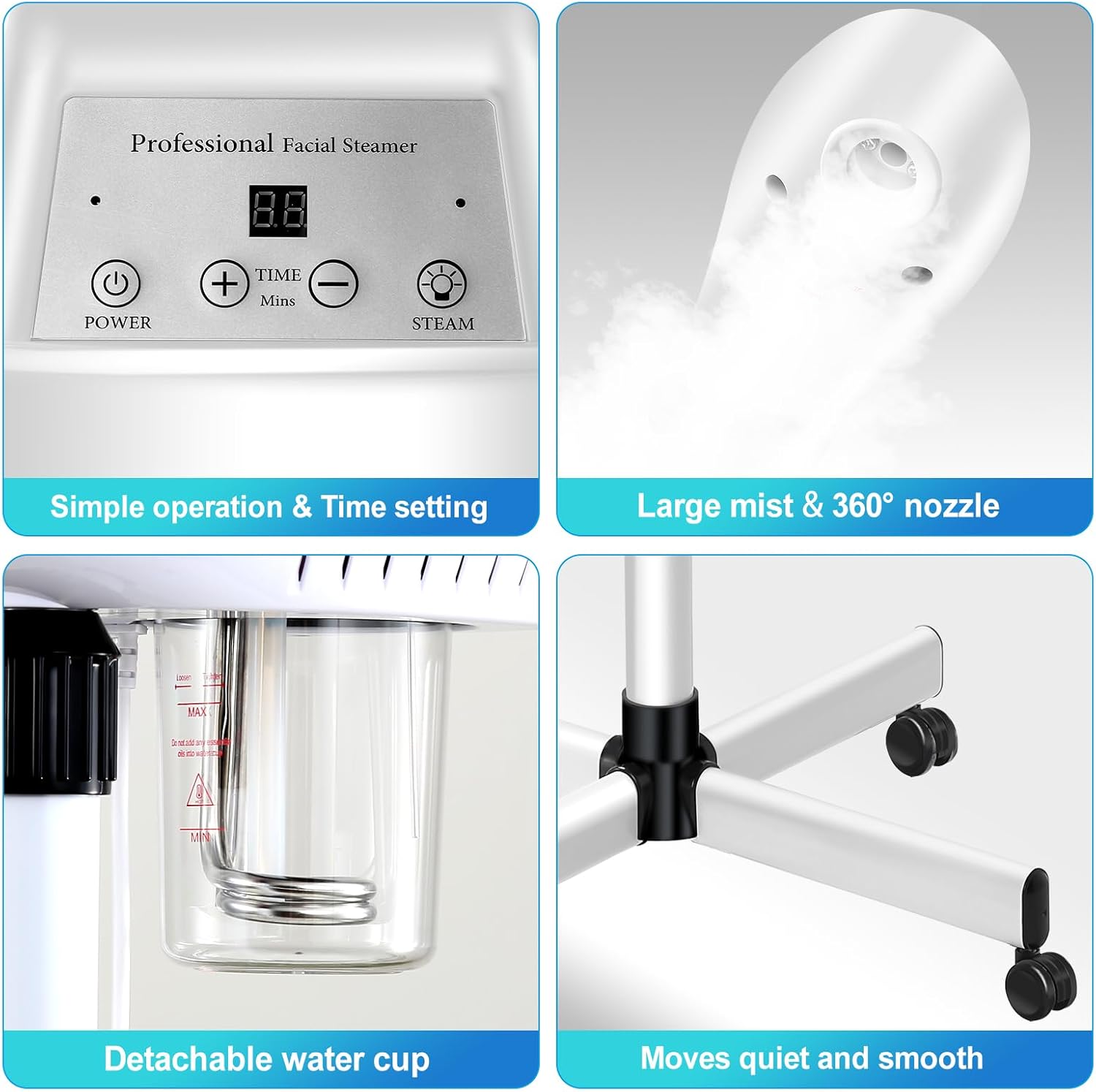 Professional Facial Steamer on Wheels, Esthetician Steamer with Hot Ozone Mist, Stand Face Steamer for Facial Deep Cleaning, Steamer for Facial for Personal Care or Spa, White