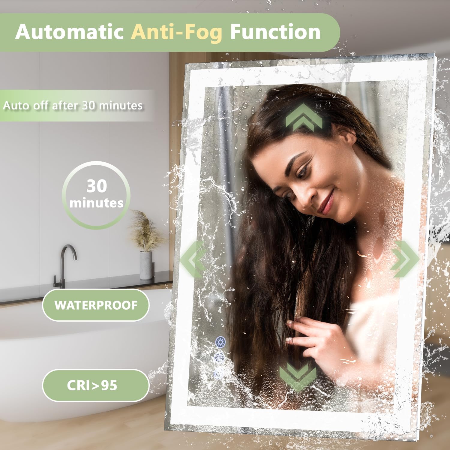 - 【Sealed Design, Waterproof & Moisture-Resistant】Fully sealed and IPX4+ rated, this mirror is specially built for humid spaces. It features certified waterproof components and grounding protection to prevent electric shock from leakage-safety you can trust. 196 LEDs/m and CRI>95 provide bright, uniform, and soft lighting without flicker or dark spots. Designed for bathroom safety but also perfect for bedroom, salon, or entryway-offering better protection and performance than standard mirrors
