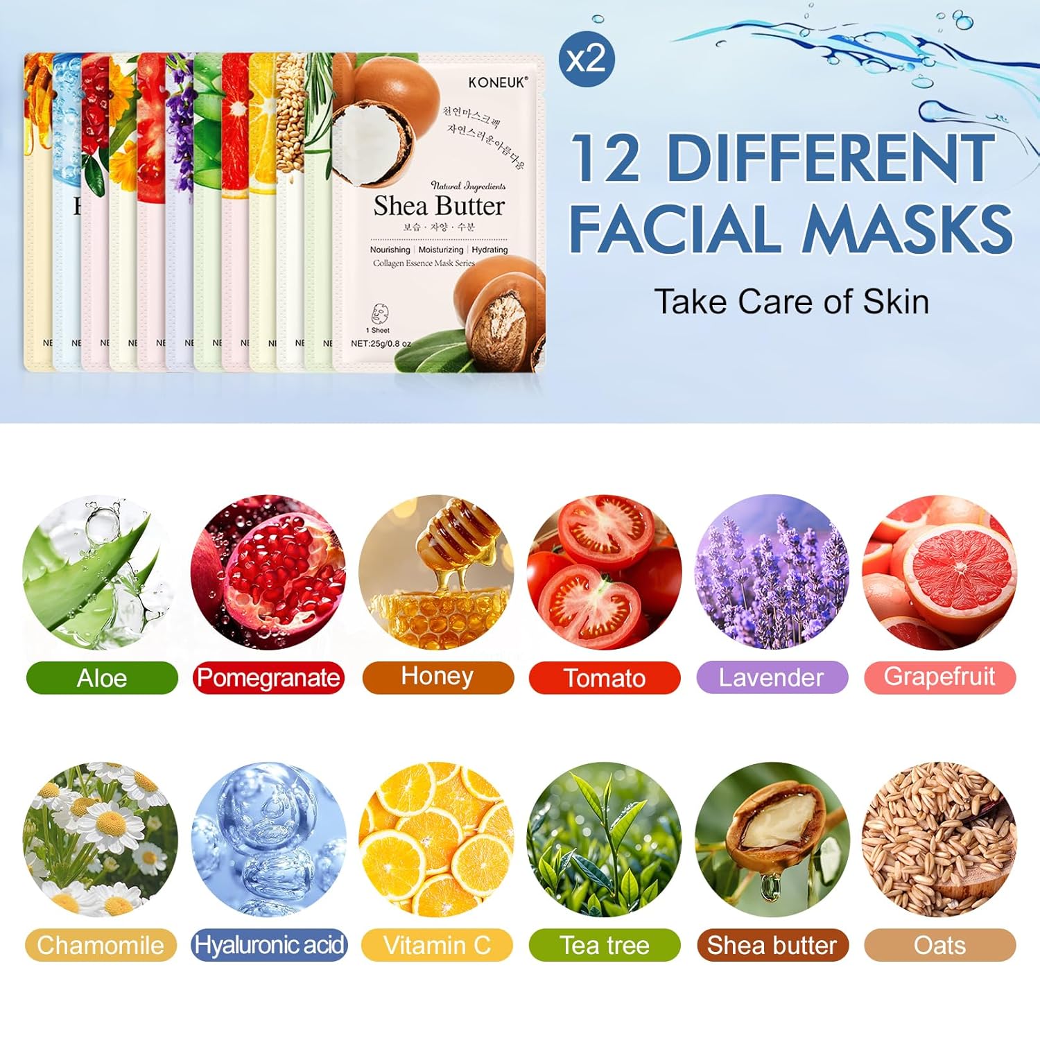 - 【24 Pack Face Masks Skincare】There are 12 different types of 24 facial mask,2 of each type,lemon,aloe,grapefruit,pomegranate,honey,hyaluronic acid,chamomile,tomato,lavender,tea tree,shea butter and oats.You can use a facial mask rich in collagen every day,they will help you improve your skin condition,making skin firmer,smoother,more elastic and more moister