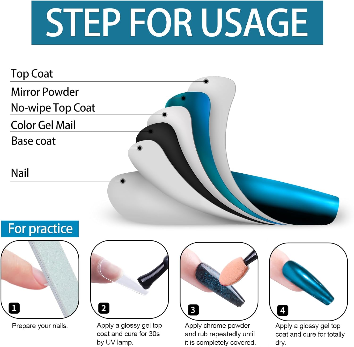 • The Scope Of Application:All chrome powders should only be applied to glossy No wipe top coat to embellish Nail-Polishes color. Otherwise it is unusable, it can't be applied directly to the nail, and it can't be applied directly to the skin. Artdone chrome powder can be applied on UV gel nails, acrylic nails or false nail tips. You can use them very easily