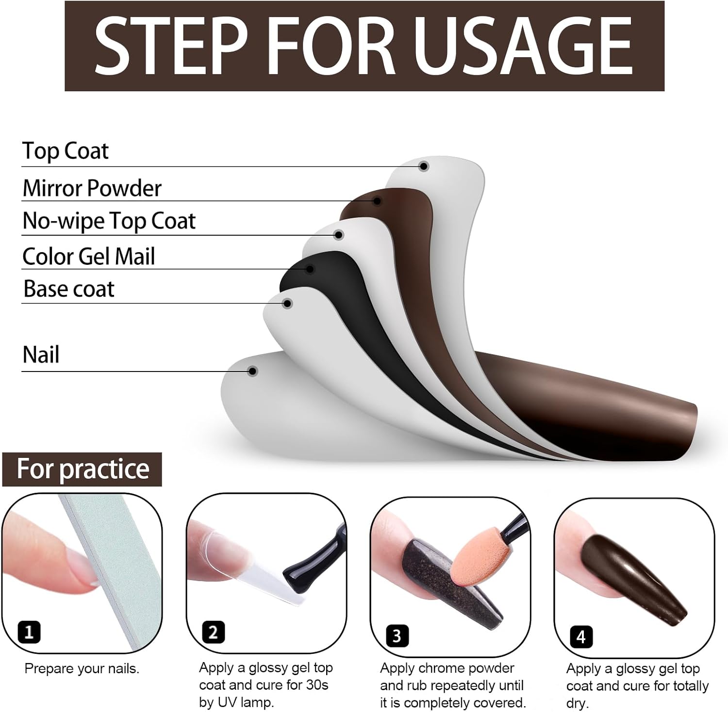 • The Scope Of Application:All chrome powders should only be applied to glossy No wipe top coat to embellish Nail-Polishes color. Otherwise it is unusable, it can't be applied directly to the nail, and it can't be applied directly to the skin. Artdone chrome powder can be applied on UV gel nails, acrylic nails or false nail tips. You can use them very easily