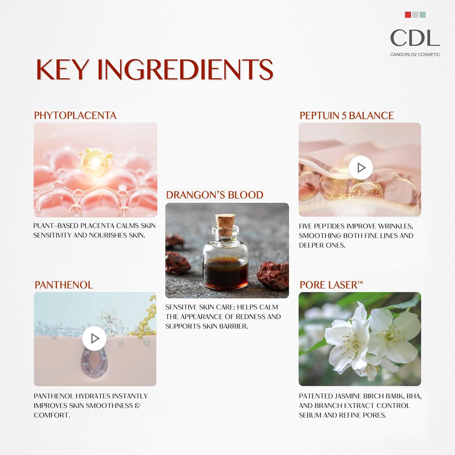 - 5 Peptides & Phytoplacenta: This dynamic mix of 5 peptides enhances skin firmness and smoothness, while Phytoplacenta, a plant-derived component, helps soothe irritation and delivers deep nourishment with vital proteins