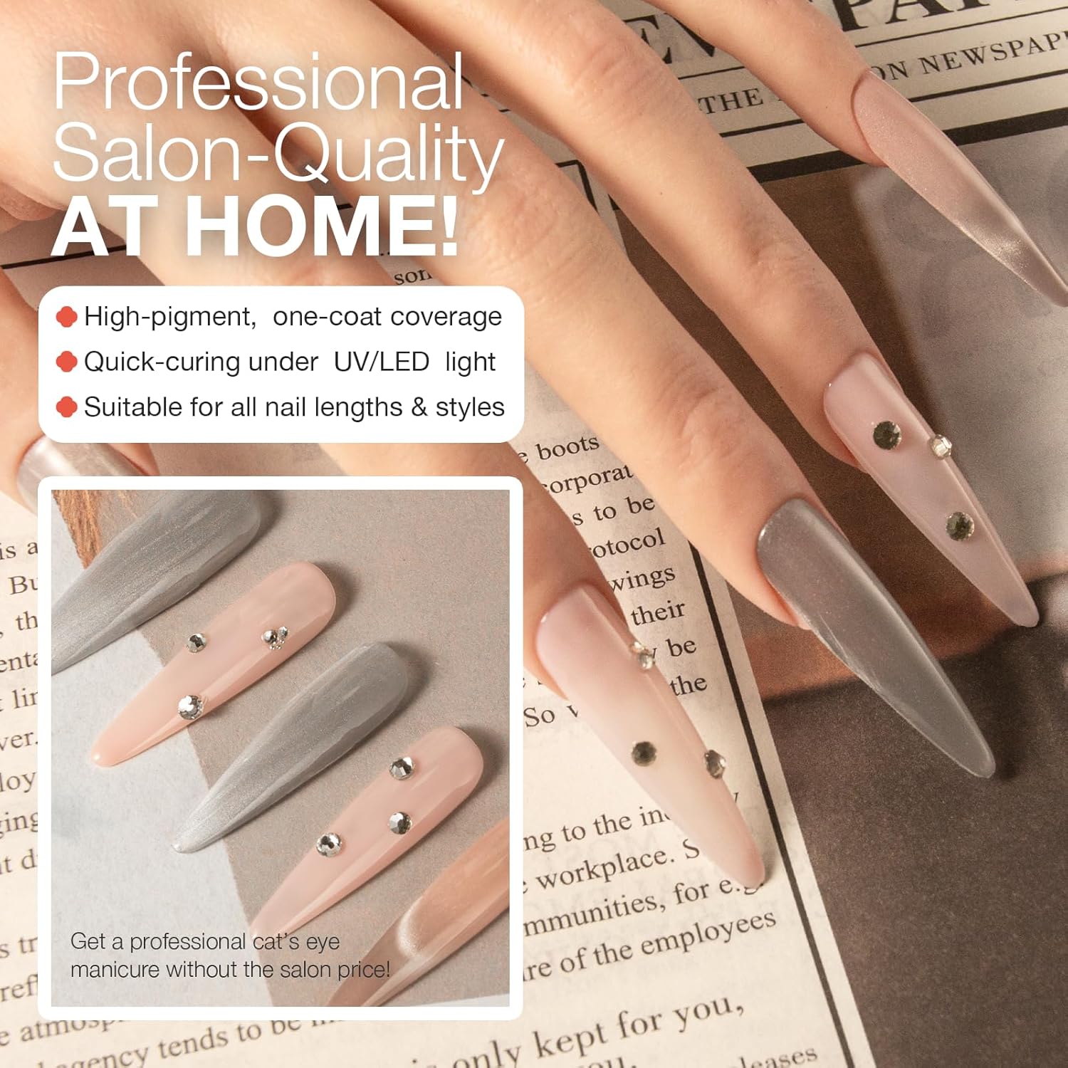 - Easy to Apply: Our gel polish glides on smoothly, providing even coverage and a flawless, glossy finish. It’s perfect for both beginners and professionals looking to create perfect cat-eye nail art at home.