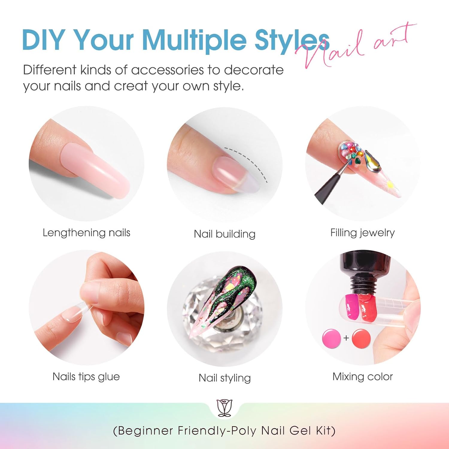 - Versatile Use: With 14 beautiful and trendy colors, it is suitable for nail art beginners and perfect for gift giving. ROSALIND poly nail extension gel kit is perfect for creating rhinestone nails, dry flower nails and glitter nails, as well as press-on nails on manicure. This poly extension gel is suitable for different shapes of nails such as square, oval, coffin and French nails.