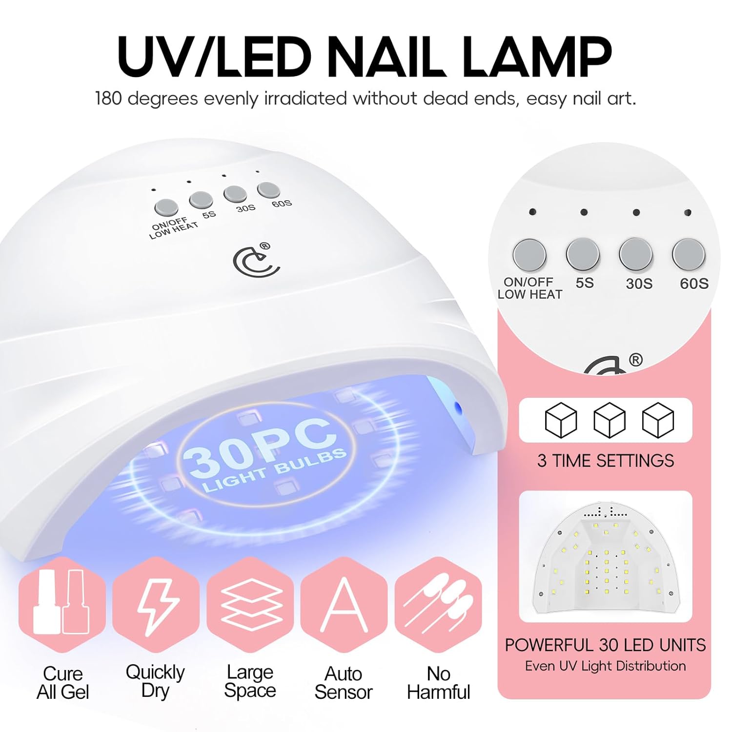 • ❤ Professional Nail Light: This gel polish kit with u v Light contains great upgraded U V Lamp. This nail lamp is automatic sensing, large space, and 30 pcs uniform distributed lamp beads, low heat mode, 3 Timer Setting - 5S / 30S / 60S, you can choose time according to your needs. The nail lamp is suitable for all gel, convenient and fast, easy to use.