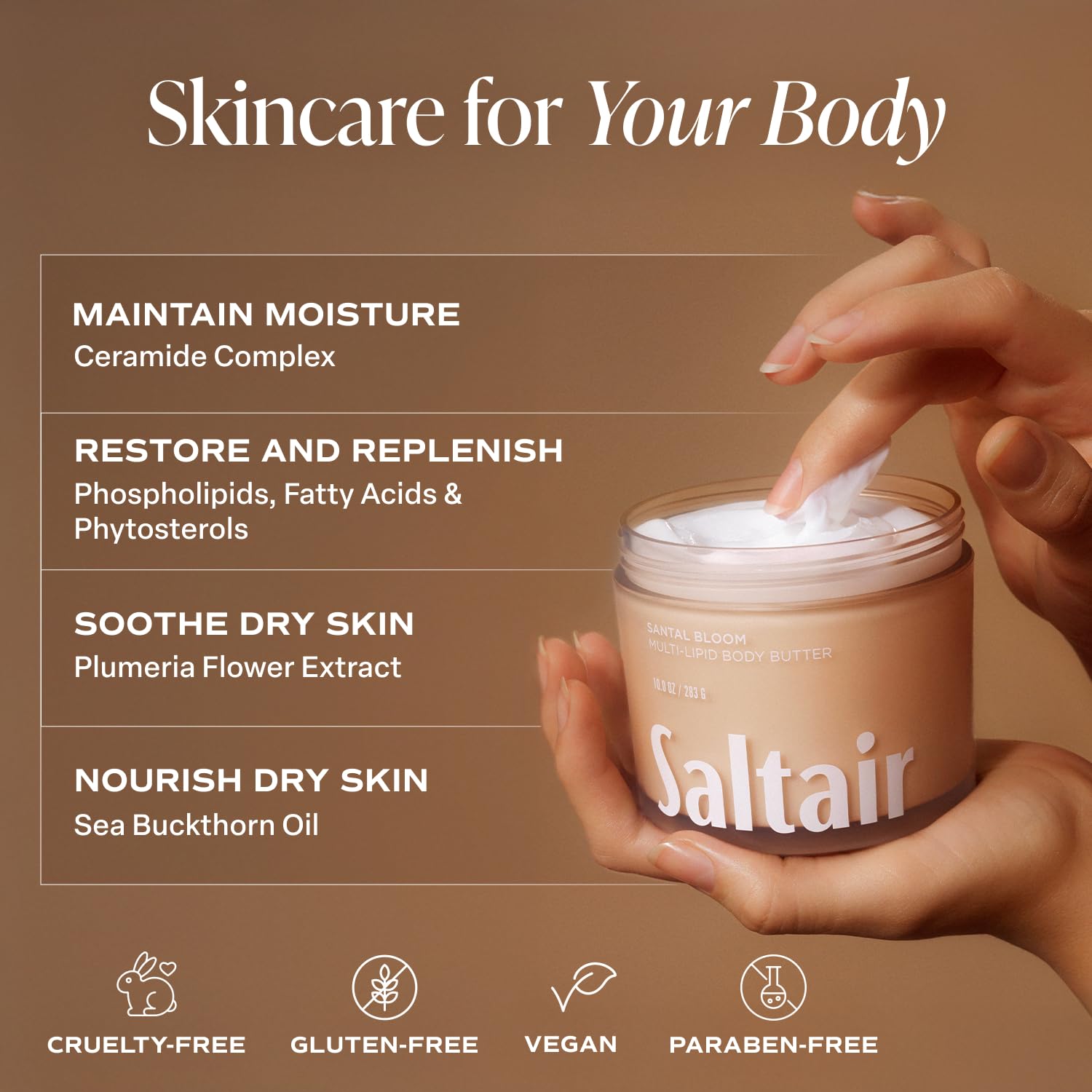 Saltair Multi-Lipid Body Butter - Rich, Nourishing Santal Bloom Hydrating Body Cream with Ceramide Complex, Coconut Oil, Shea Butter, and Sea Buckthorn. Deep Moisturizing Dry Skin Care. 10oz Jar