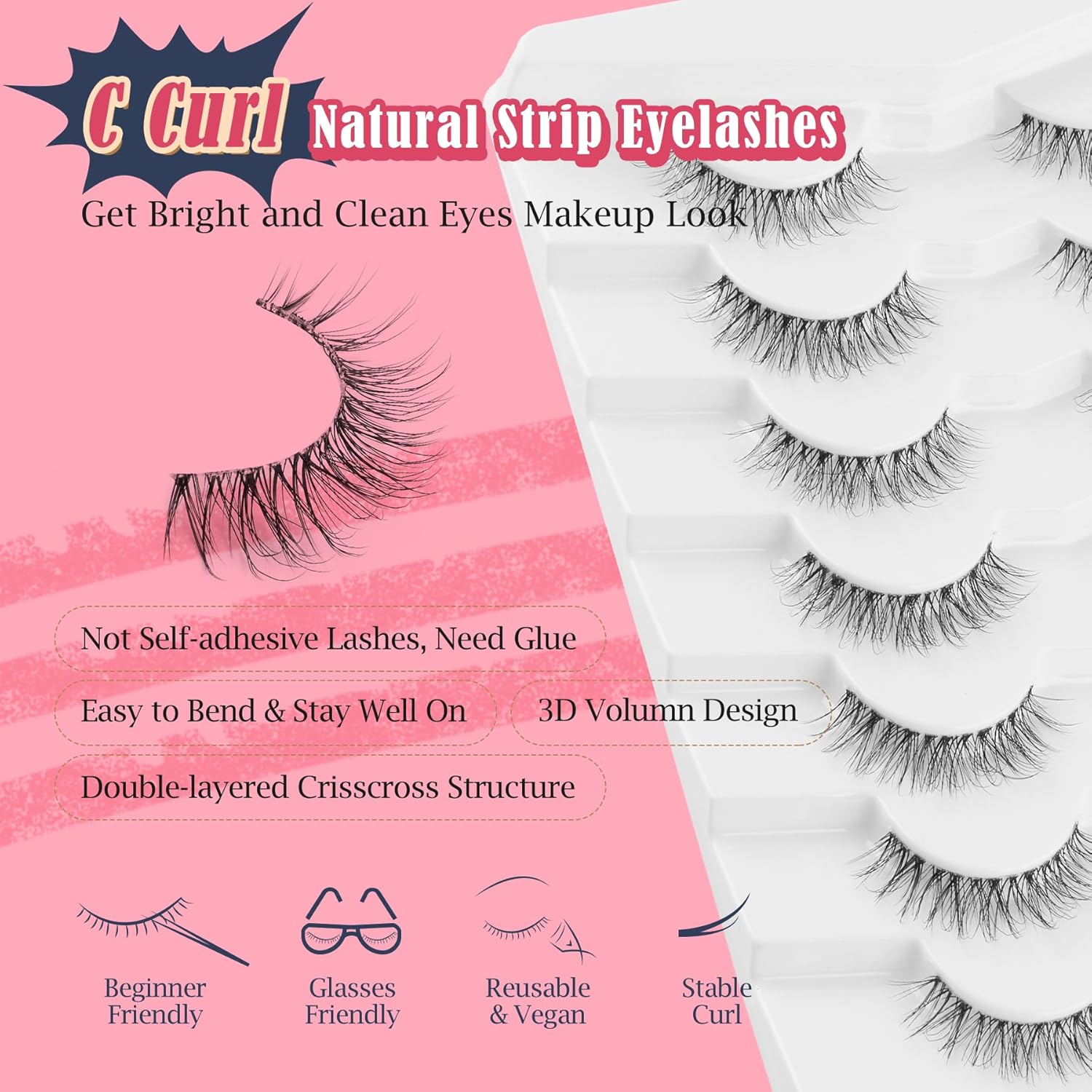 - VEGAN & REUSABLE: 7 pairs wispy lashes pack. The fake eyelashes use ultra-light faux mink fibers, cruelty-free, skin friendly. Bring pretty lashes extension look without damaging your own eyelashes, suit for DAY-TO-DAY use, party and so on