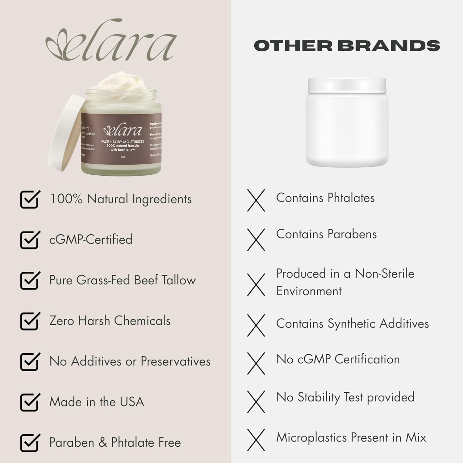 • NATURAL MOISTURIZER: Elara is a 100% natural grass fed beef tallow moisturizer for the face and body. It is packed with tallow's natural vitamins A, D, E, and K for skin nourishment. It is mixed with marula and sweet almond oil for a pleasant creamy texture. Beef tallow provides deep hydration to the skin.