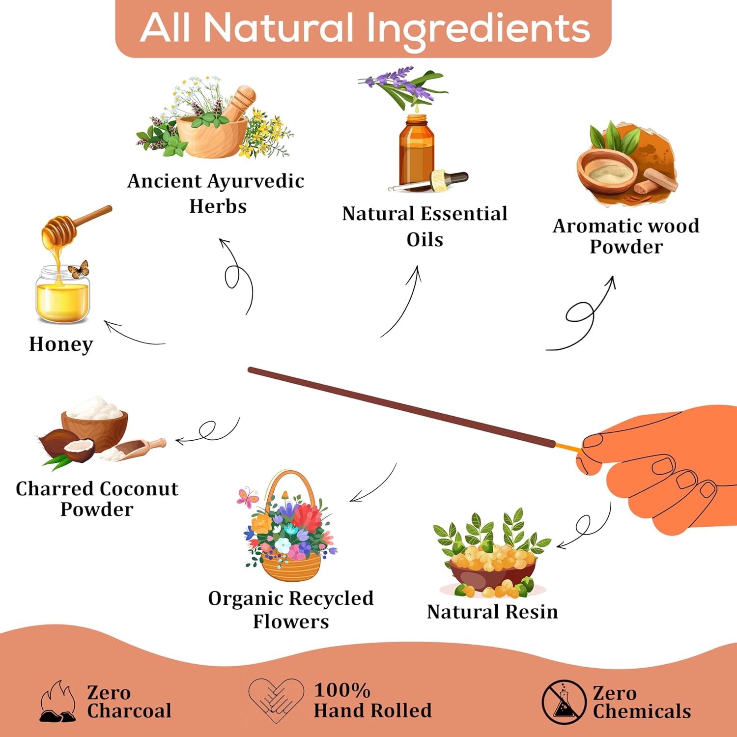 - 100% NATURAL Natural incense Sticks completely handmade MADE FROM SCRATCH by blending natural resins, Herbs, Spices with aromatic wood powders, charred coconut powder fragrant oils and honey.No Dipping in Toxic Chemicals.