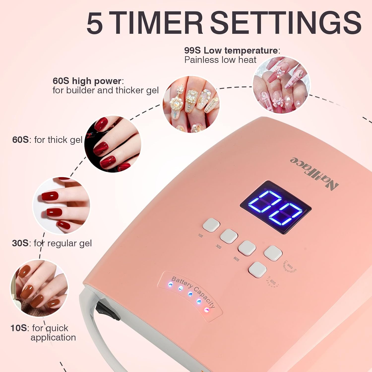 - Smart Gel Curing Lamp: Auto-sensing technology activates cordless UV nail lamp upon hand insertion; 5 settings β 10s for polish drying, 30s/60s for standard gels, 99s low-heat mode for sensitive applications; Optimized for builders and hard gels