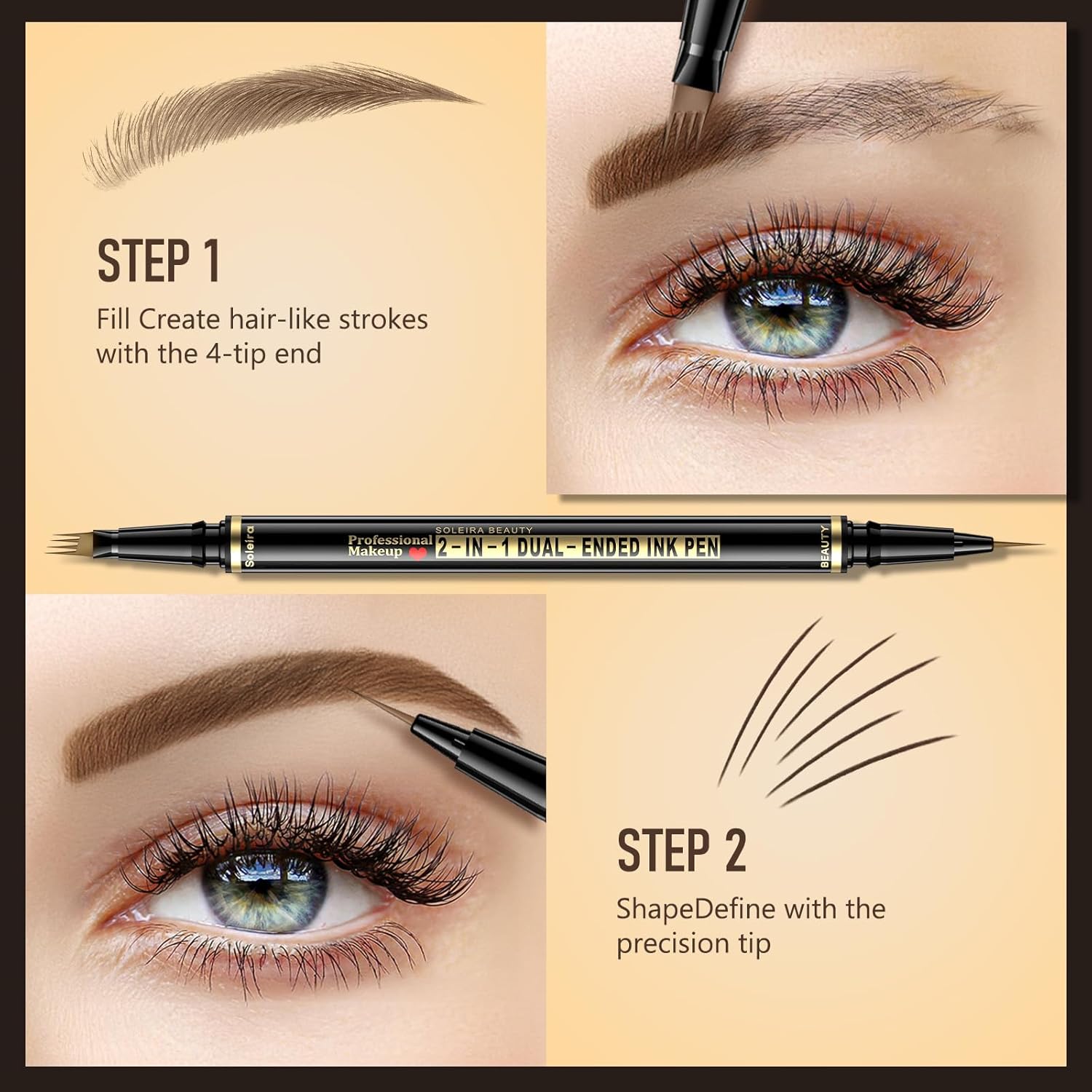 Eyebrow Pen, Soleira Waterproof Eyebrow Pencil with 4 Tip Microblading Eyebrow Pen and Dual-ended Eyebrow Brush, for Natural-Looking Brows, Long-Lasting, COCO Dark Brown