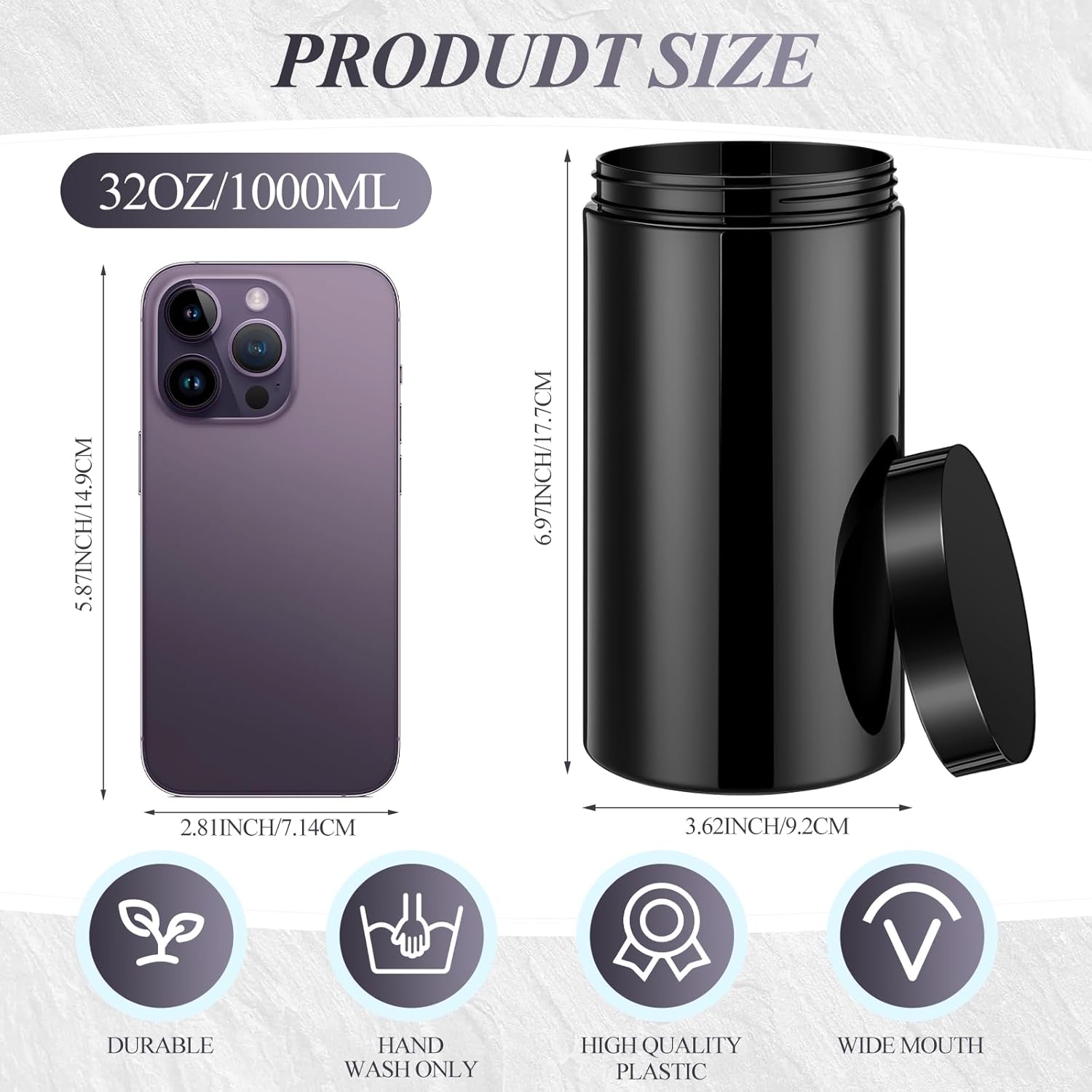 • What You Receive: there are 4 pieces plastic jars with black screw-on lids; They are durable and refillable, measuring about 32 oz in capacity