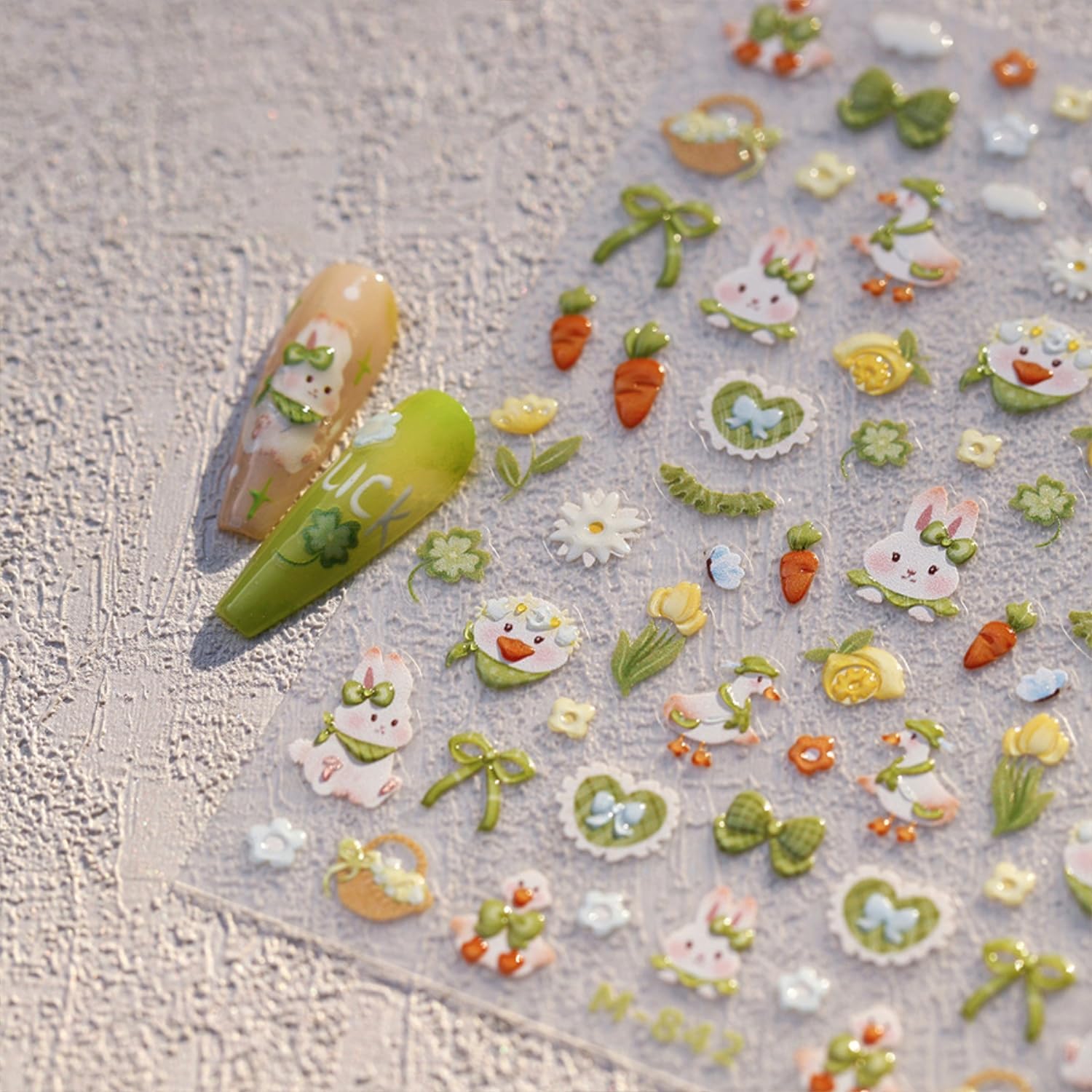 Easter Nail Stickers for Nail Art 5D Self Adhesive Nail Decals Cute Bunny Nail Art Stickers Green Bow Flower Nails Design Easter Nail Supplies for DIY Manicure Decoration for Women Girls