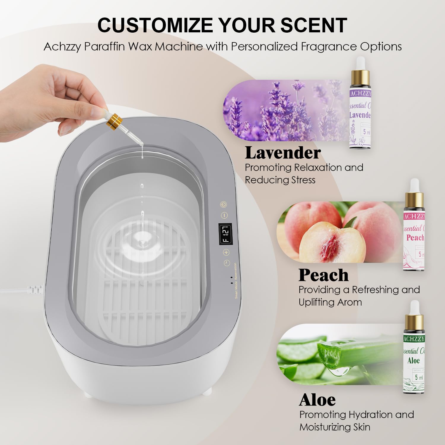 - COMPLETE KIT WITH UNSCENTED WAX & CUSTOMIZABLE SCENTS - The Achzzy Paraffin Machine includes a comprehensive accessory package, providing everything you need for a perfect paraffin wax bath right out of the box. It features odorless paraffin wax, ideal for customers sensitive to strong scents, along with 3 essential oils - Lavender, Peach, and Aloe. These oils allow you to customize the fragrance to your preference, making the experience both soothing and personalized. Whether you prefer a scent-free treatment or a delightful aroma, the Achzzy Paraffin Machine caters to all your needs