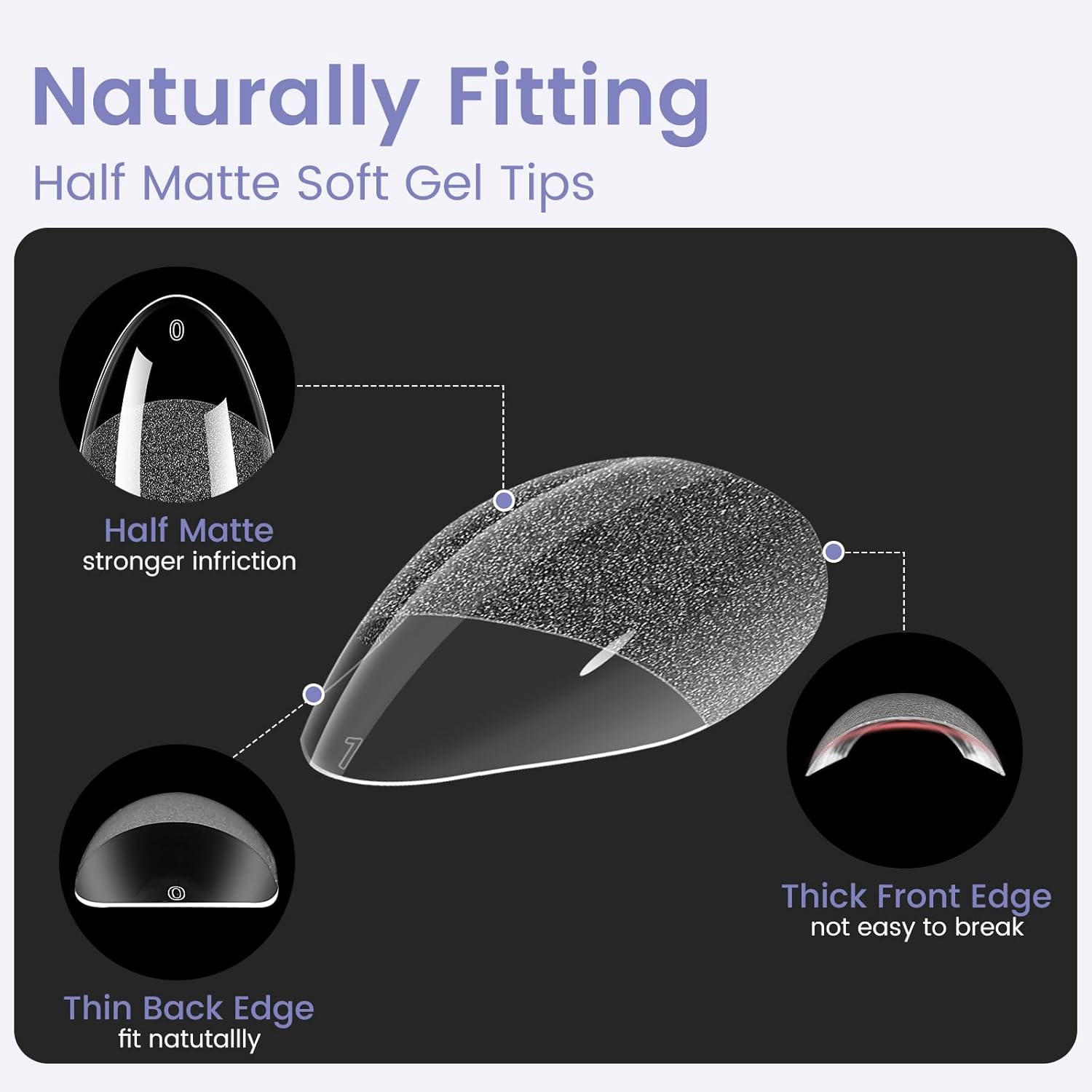 - Soft Gel Material for Comfort and Flexibility-Made from soft gel jelly, these nail tips almond offer a comfortable and flexible fit on your natural nails. designed to blend seamlessly with natural nails for a comfortable and natural look. Easily create stunning nail art by combining these tips with nail polish, impregnating powders, and acrylic powders, offering a salon-quality experience without the high costs