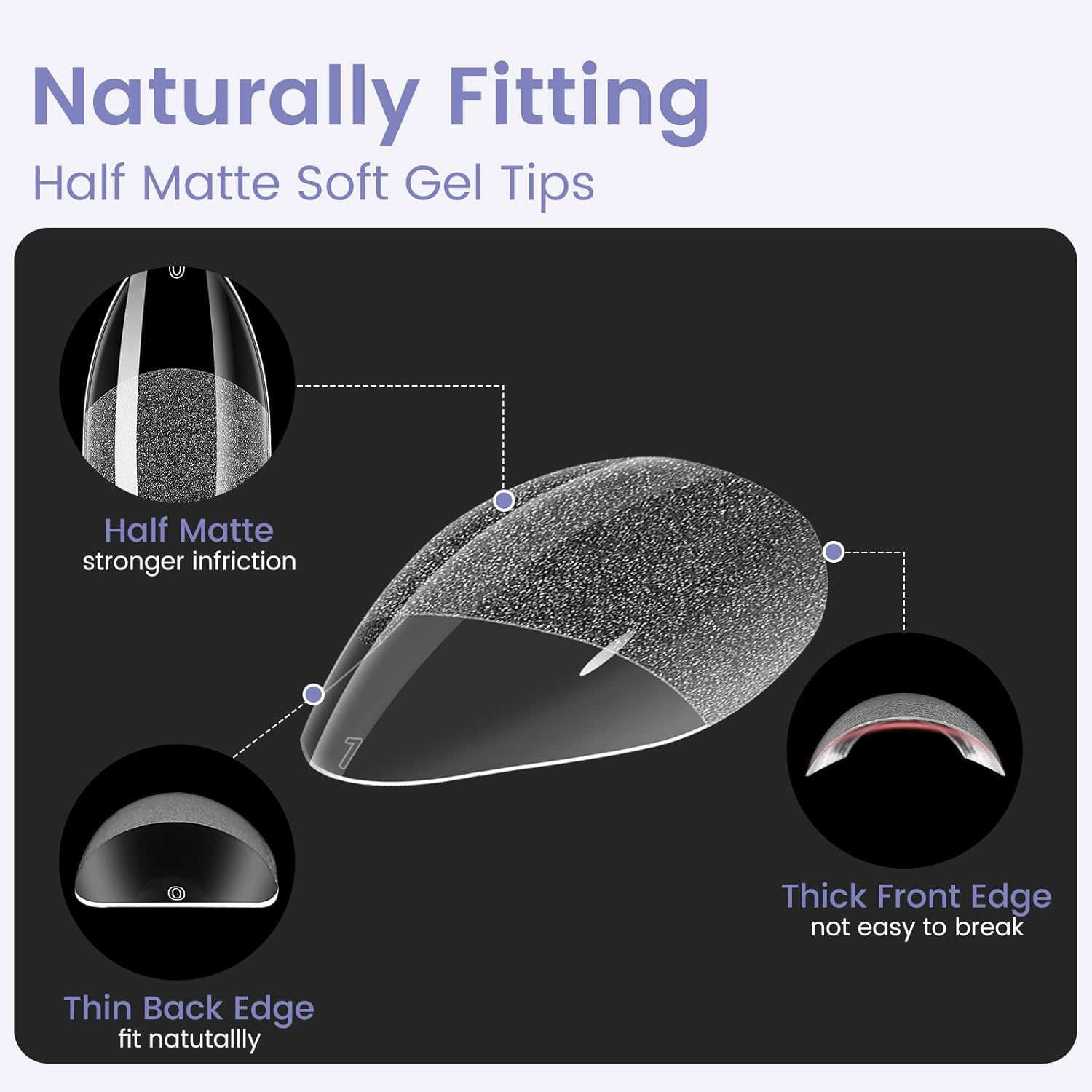 • No Need to File Matte Texture - The nail tips almond shape feature a inner semi-frosted finish that enhance stronger friction to your nails, better fitting your natural nails. You can stick the half-matte nail tips with nail glue directly, enjoying the advantage of “ NO NEED FILE ”to saving your time and effort. No worry that your nails will become thinner and uglier due to polishing, providing better care for your nails with Wilfniee no file fake nail tips