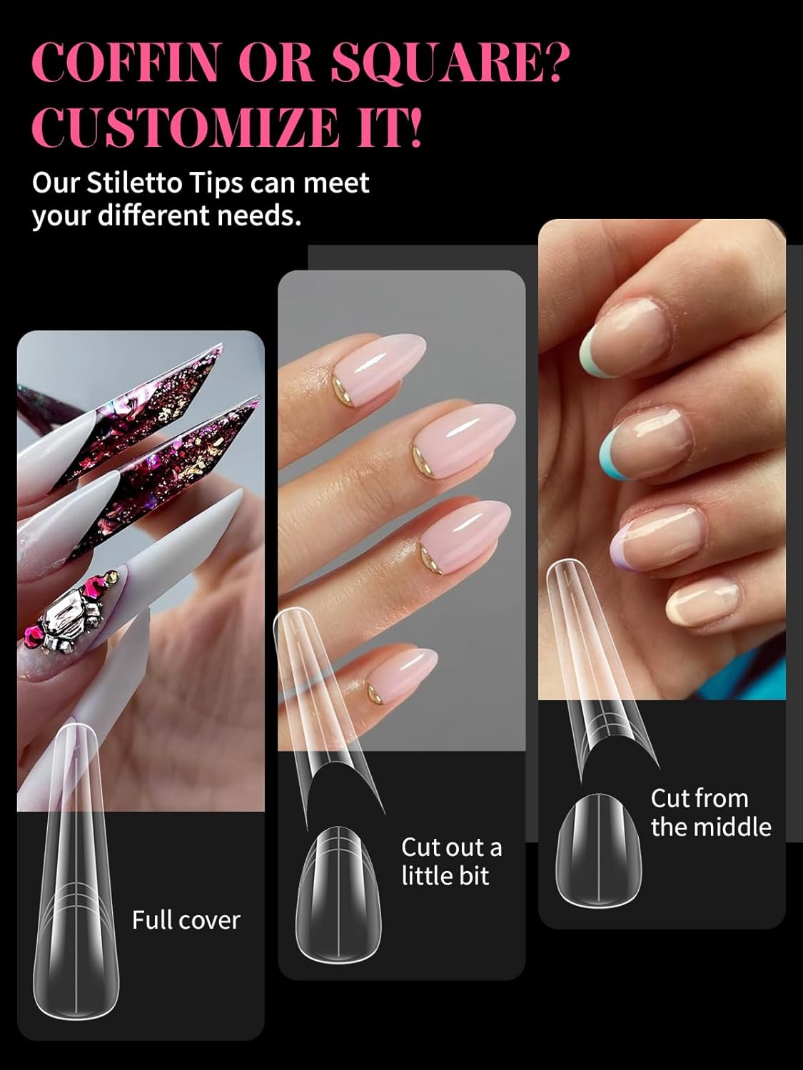• 【Nail Form Mold with 15 Sizes】150pcs stiletto clear dual forms for poly nail gel offers 15 different nail sizes , and each size of long nail tips is separated by a small grid, a total of 15 grids, so they're easy and convenient to choose the suitable size to meet your nail's need.