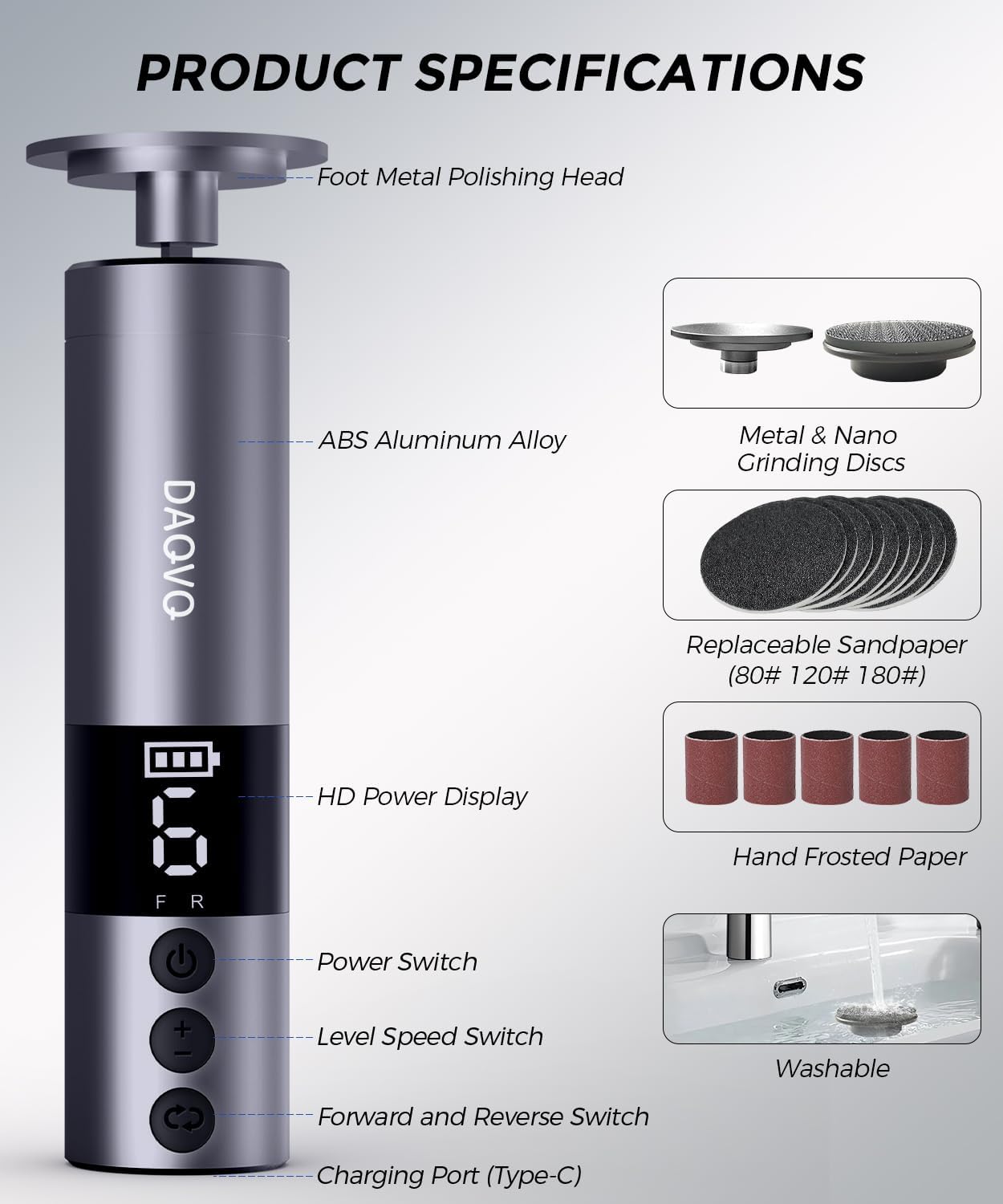 - Well Made & Ideal Gift: The DAQVQ Electric Foot Callus Remover is crafted with a sleek, anti-slip aluminum body, multi-frequency motor-mechanism, and high copper core features strong torque ensuring a smooth & pain-free experience. A thoughtful gift for wife, mom, best friend classmate or colleague, offering you beautiful feet and saving you time and money on foot spa treatments
