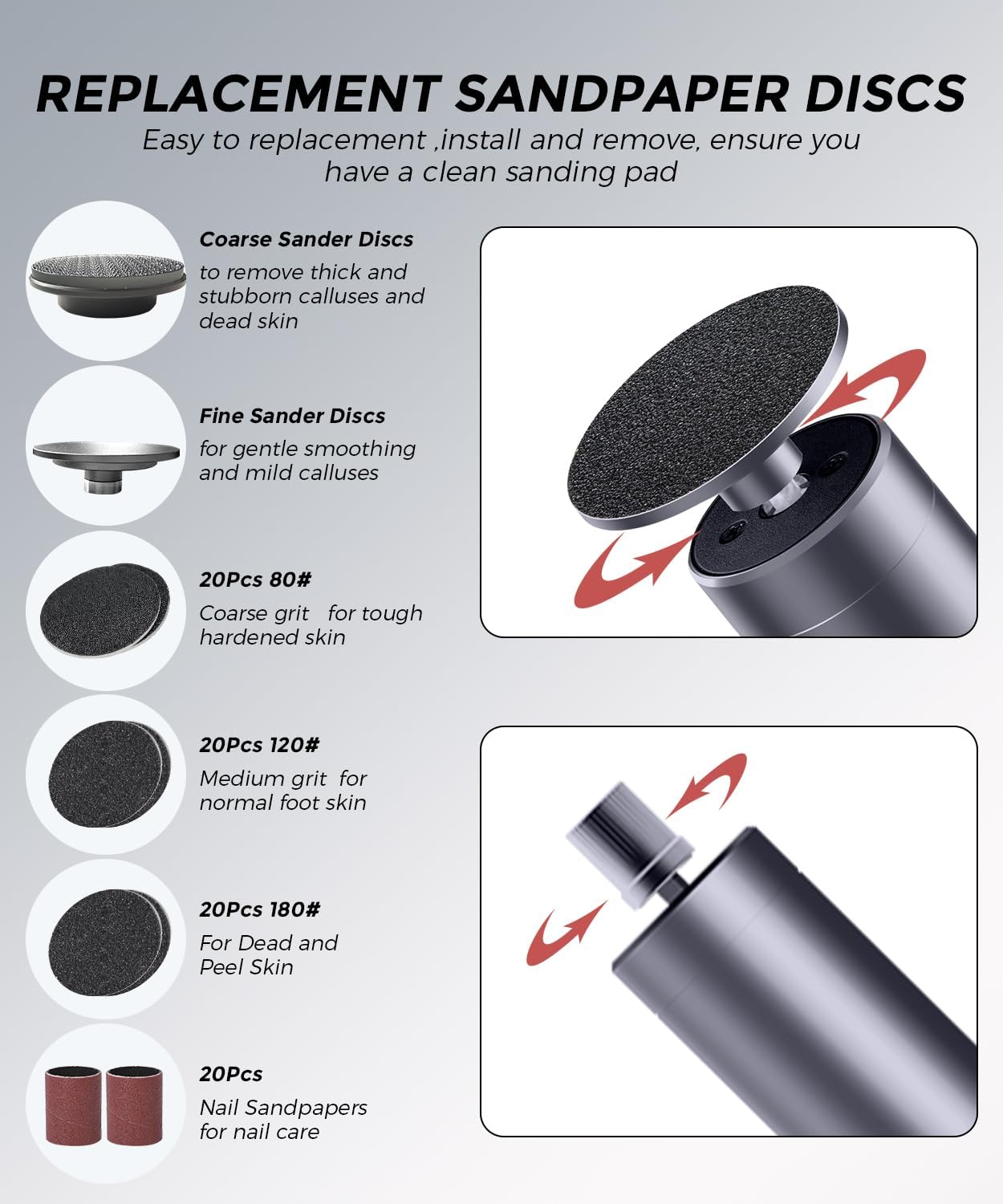 - Upgrade Nano-Glass Grinding Discs & 60 Replaceable Sandpaper 3 Grit Levels: Our electric foot filer comes with a superior washable and reuseable Nano-Glass head, which is made by the new generation of nano-particles,can remove calluses and dead skin more evenly and gentle for skin. It is also equipped with 60PCS Grit Papers and 20PCS Nail Sandpapers,which are self-adhesive and easy to replace,offering versatility for different foot or nail care needs