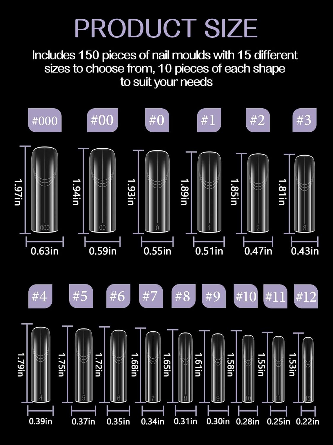 • Included Components : 15 Different Sizes, 150 Dual Form Nail Molds