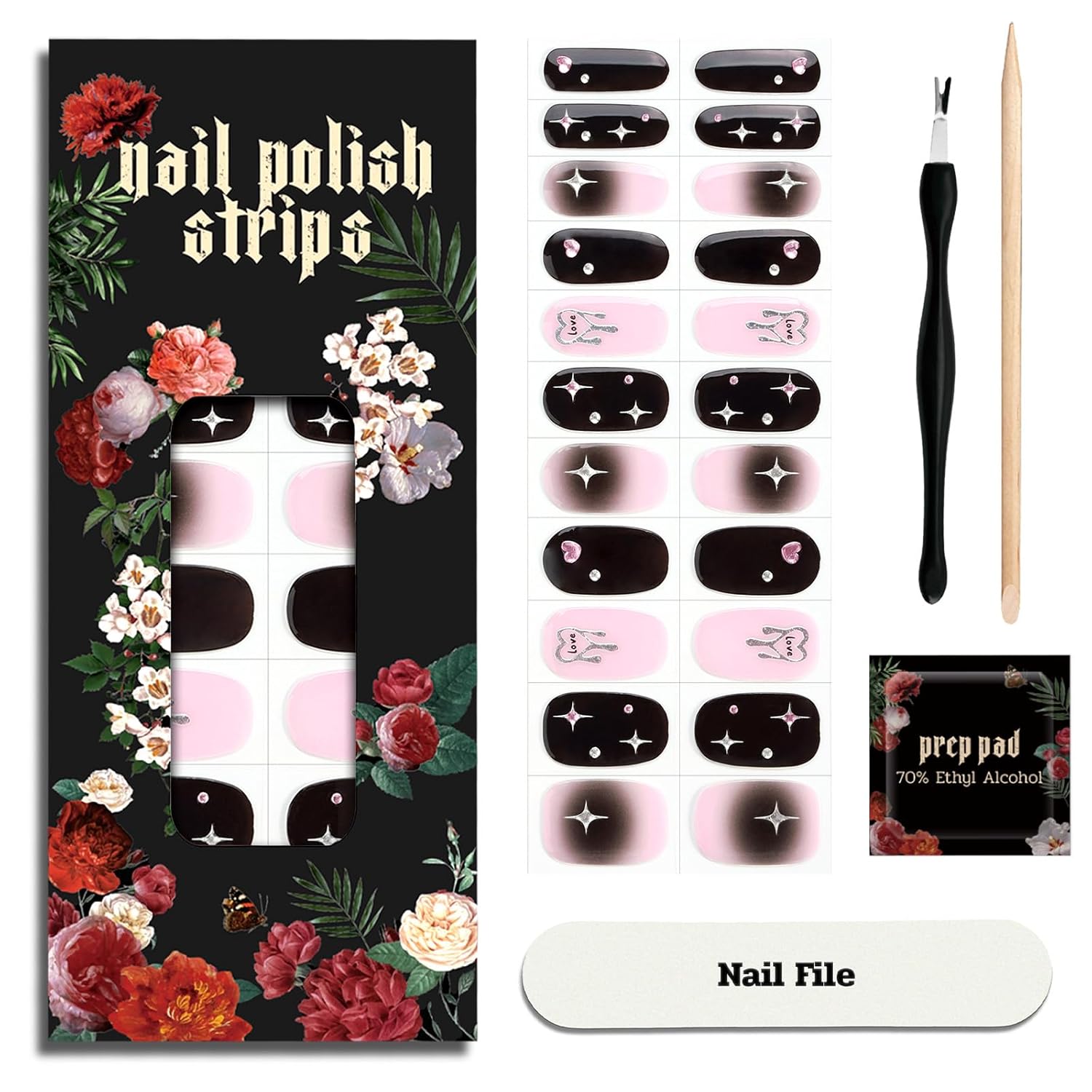 Nail Polish Strips - 22 Pcs Salon Quality Gel Nail Stickers - Long Lasting Wraps (Starlit Blooming Black&Pink)