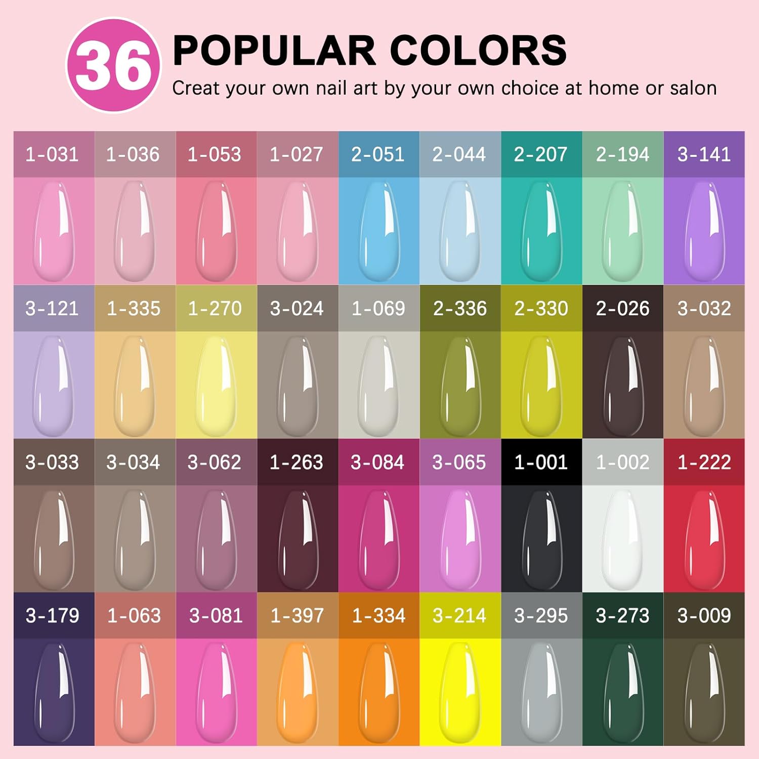 - ăEasy Application & Long lastingăOur Gel Nail Polish with UV Lamp Set includes all the tools you need for a complete manicure, allowing you to easily create your own nail art. With 36 carefully selected colors, you can mix and match according to your mood and ideas, including black, white, green, yellow, pink and more. Following the instructions in our manual, you can enjoy up to 28 days of flawless, chip-resistant nails.